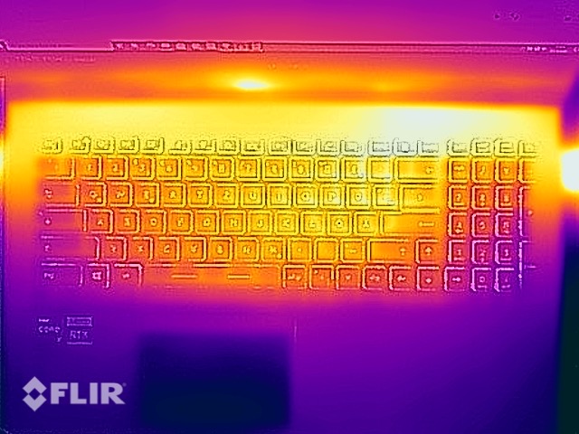 Das WE76 hat keine Temperaturprobleme, denn bei einfachen Aufgaben bleibt das gesamte Gehäuse sehr kühl. Unter Last gibt es zwar einen Bereich hinten links auf der Unterseite, wo wir mehr als 55 °C messen können, doch da man diese mobile Workstation kaum auf den Oberschenkeln nutzen wird, ist das in unseren Augen kein Problem. Die Tastatur wird bei hoher Last ebenfalls spürbar wärmer, aber hier gibt es keine Einschränkungen beim Tippen.