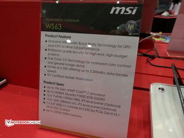 Das aktuelle WS63 basiert auf dem GS63VR-Gehäuse und ist maximal mit einer Quadro P3000-Grafikkarte seit letztem Jahr verfügbar. Auf der Computex 2017 haben wir allerdings in Erfahrung bringen können, dass das WS63 Ende Juli mit einer aktuell noch nicht offiziell angekündigten Quadro GPU auf den Markt kommen soll. Wir spekulieren auf die auf der GTX 1070 basierenden Quadro P4000, die allerdings bereits im HP ZBook 17 G4 verfügbar ist.