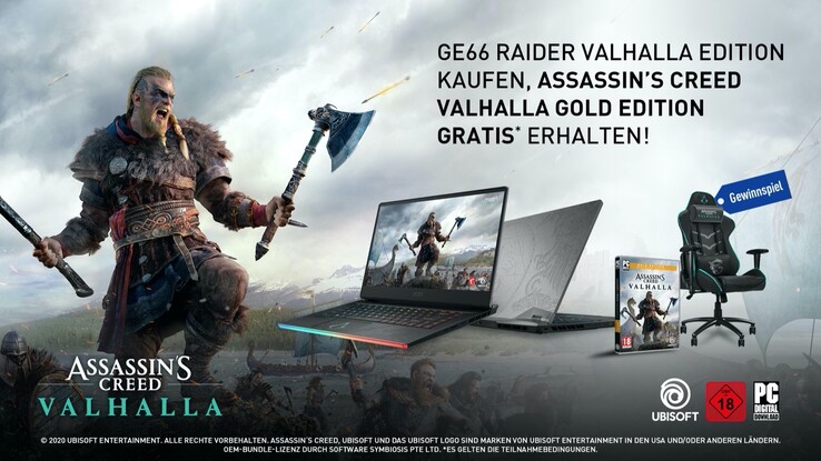 Das MSI GE66 Raider in der Assassin's Creed Valhalla Special Edition (10SF-640) soll bereits in wenigen Tagen bei diversen Händlern für eine unverbindliche Preisempfehlung von 2.399 Euro verfügbar sein. Käufer erhalten Assassin's Creed Valhalla (ca. 44 Euro auf Amazon) kostenlos, und zwar in der Gold Edition, die auch den Season Pass enthält.