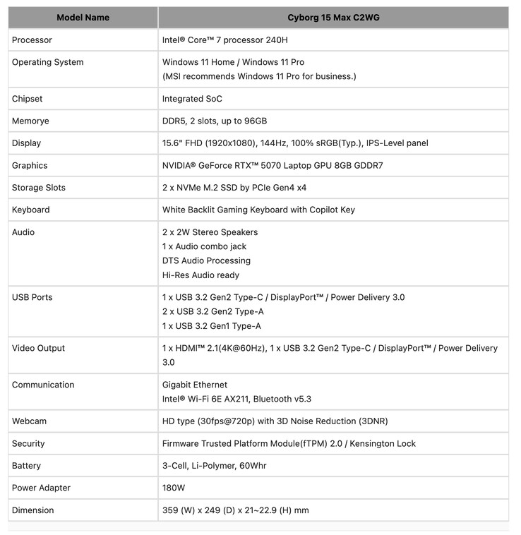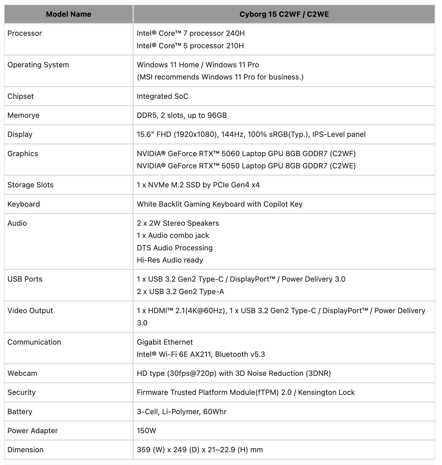 Gleichzeitig hat MSI das Crosshair 16 HX um die Varianten E14WGK, E14WFK und E14WEK erweitert, die je nach Modell auf den Core i7 14650HX oder den Core i9-14900HX sowie auf 8GB-Versionen der GeForce RTX 5050, GeForce RTX 5060 oder GeForce RTX 5070 setzen. Darüber hinaus hat MSI auch drei neue 15-Zoll-Cyborg-Laptops vorgestellt, nämlich das Cyborg 15 Max, das C2WG Cyborg 15 C2WF und das Cyborg 15 C2WE, die ähnliche Spezifikationen wie die Modelle aus dem vergangenen Jahr bieten. Preise und Verfügbarkeit der neuen Modelle hat MSI bislang allerdings noch nicht bestätigt. Weitere Details dazu nennt das Unternehmen in seiner Pressemitteilung.
