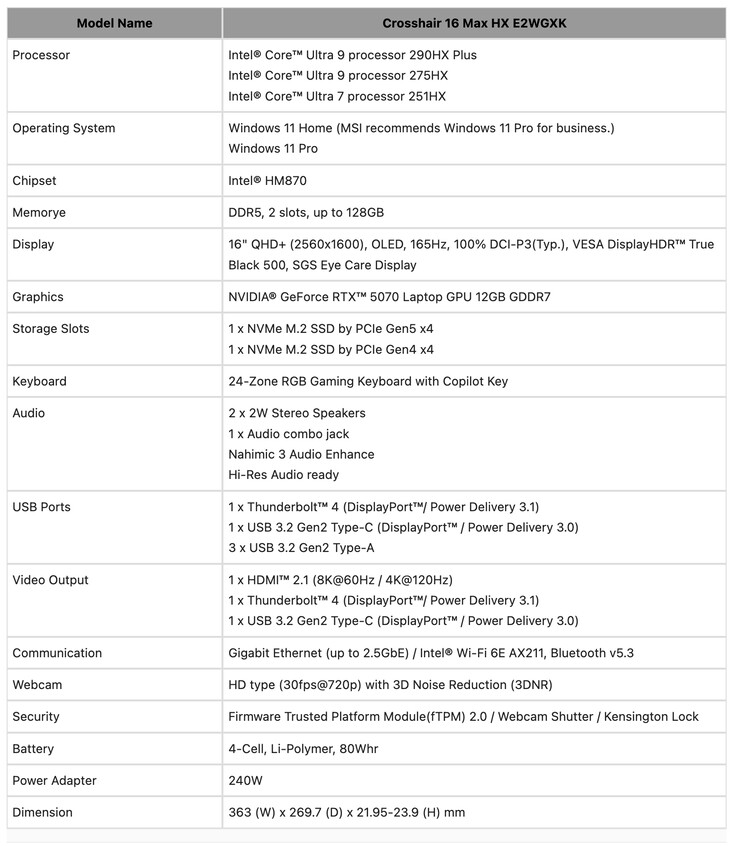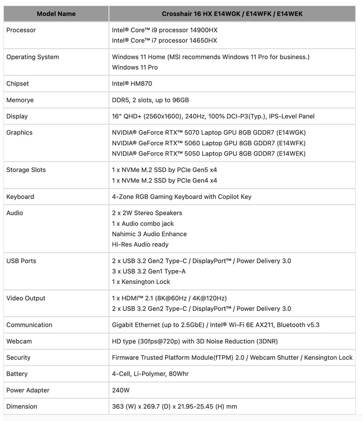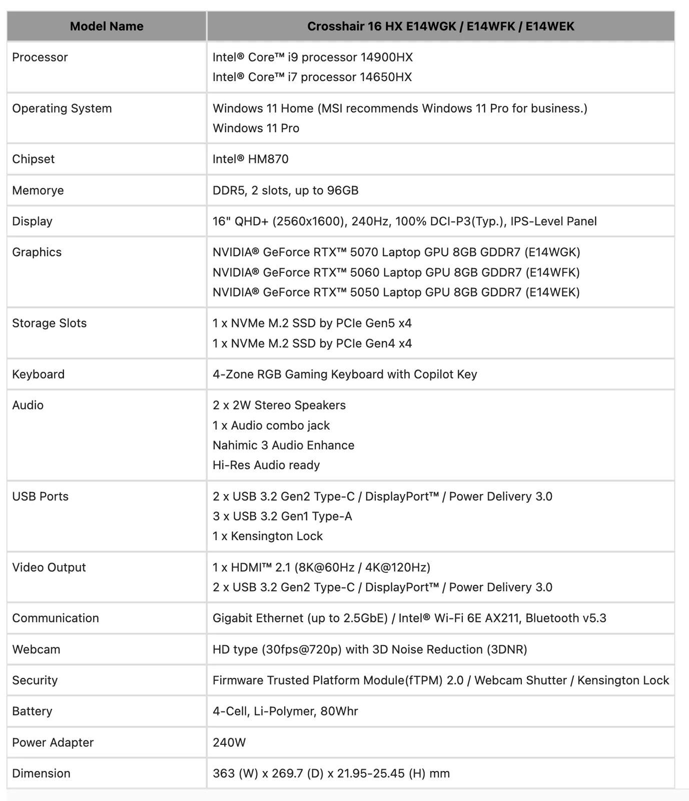 Übrigens ist das Crosshair 16 Max HX E2WGXK der erste bestätigte Laptop, der mit Nvidias noch nicht veröffentlichter RTX 5070 Laptop-GPU mit 12GB auf den Markt kommt. Die anderen sieben oben aufgeführten Laptops sind derweil entweder mit der GeForce RTX 5070 Ti, der GeForce RTX 5080 oder der GeForce RTX 5090 ausgestattet.