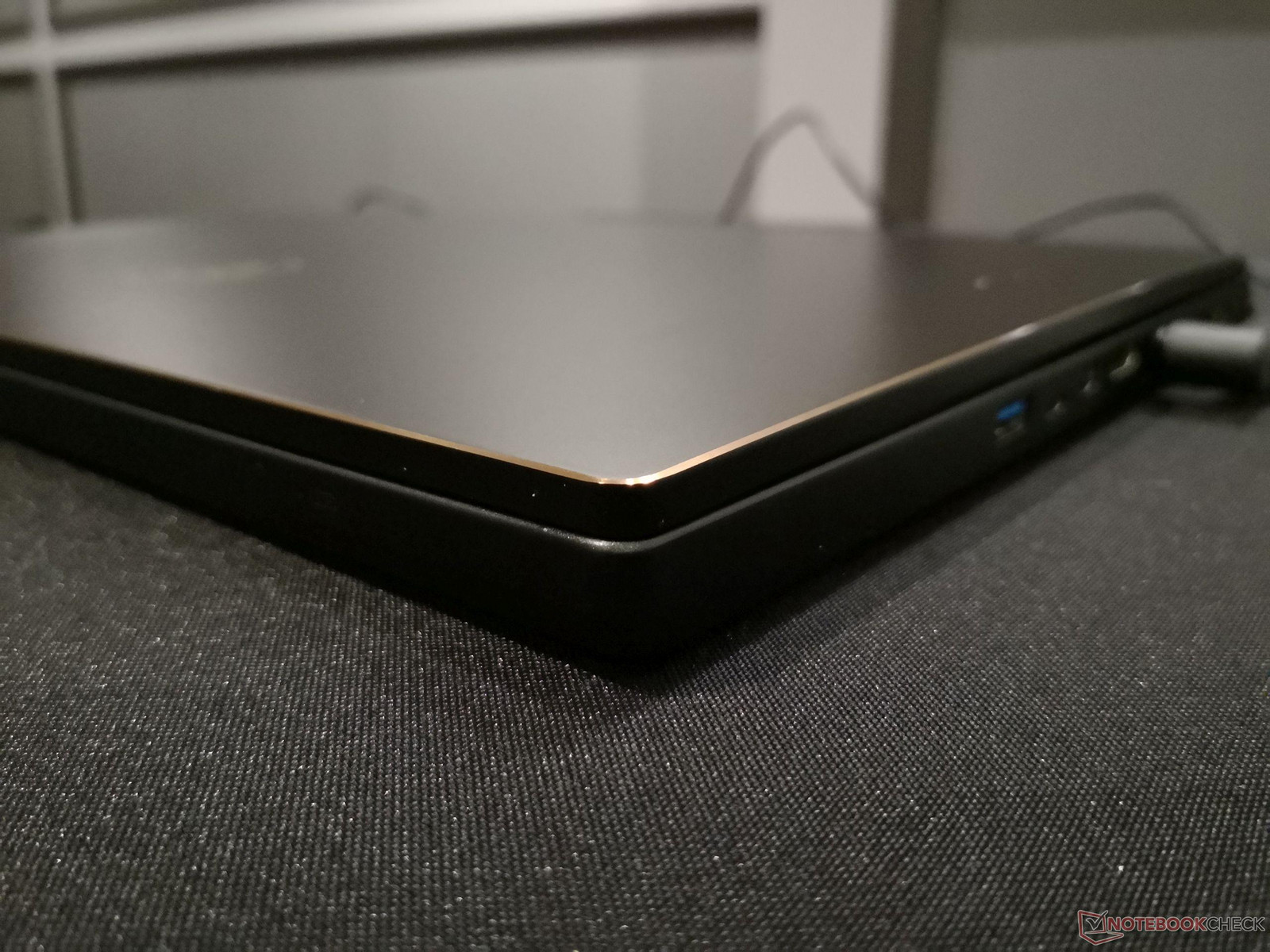 Die kurze Zeit, die wir mit dem Vorserienmodell verbringen konnten, hat bestätigt, dass MSI sich eindeutig für ein hochwertiges und dezenteres Design entschieden hat dass auch im geschäftlichen Umfeld eine gute Figur macht. Die matt-schwarzen Oberfläche, das dezent goldene Emblem und die weniger auffälligen gold-farbenen Akzente hinterlassen einen deutlich professionelleren Eindruck. Die Gehäusequalität scheint gegenüber dem GS63 jedoch leider nicht wirklich verbessert worden zu sein: Sowohl Base als auch Deckel ließen sich deutlich leichter verwinden als dies beim XPS 15, Gigabyte Aero 15 und Spectre x360 15 der Fall war. MSI hat uns zugesichert, dass dieses Vorserienmodell jedoch nicht nicht dem endgültigen Stand entspricht. Mit einer endgültige Beurteilung warten wir also noch ab.
