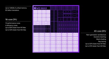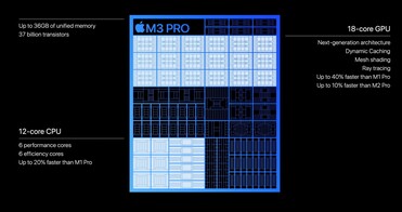 Gegen Aufpreis bietet Apple den M3 Pro mit sechs Performance- und sechs Effizienz-Kernen, einem Grafikchip mit bis zu 18 Recheneinheiten und bis zu 36 GB Arbeitsspeicher an. Das Topmodell des 14 Zoll und 16 Zoll MacBook Pro ist mit dem Apple M3 Max ausgestattet, der zwölf Performance-Kerne, vier Effizienz-Kerne, 40 GPU-Kerne sowie maximal 128 GB RAM besitzt. Laut Apple erreicht der M3 Max eine 50 Prozent höhere CPU- und eine 20 Prozent schnellere GPU-Leistung als der Apple M2 Max.