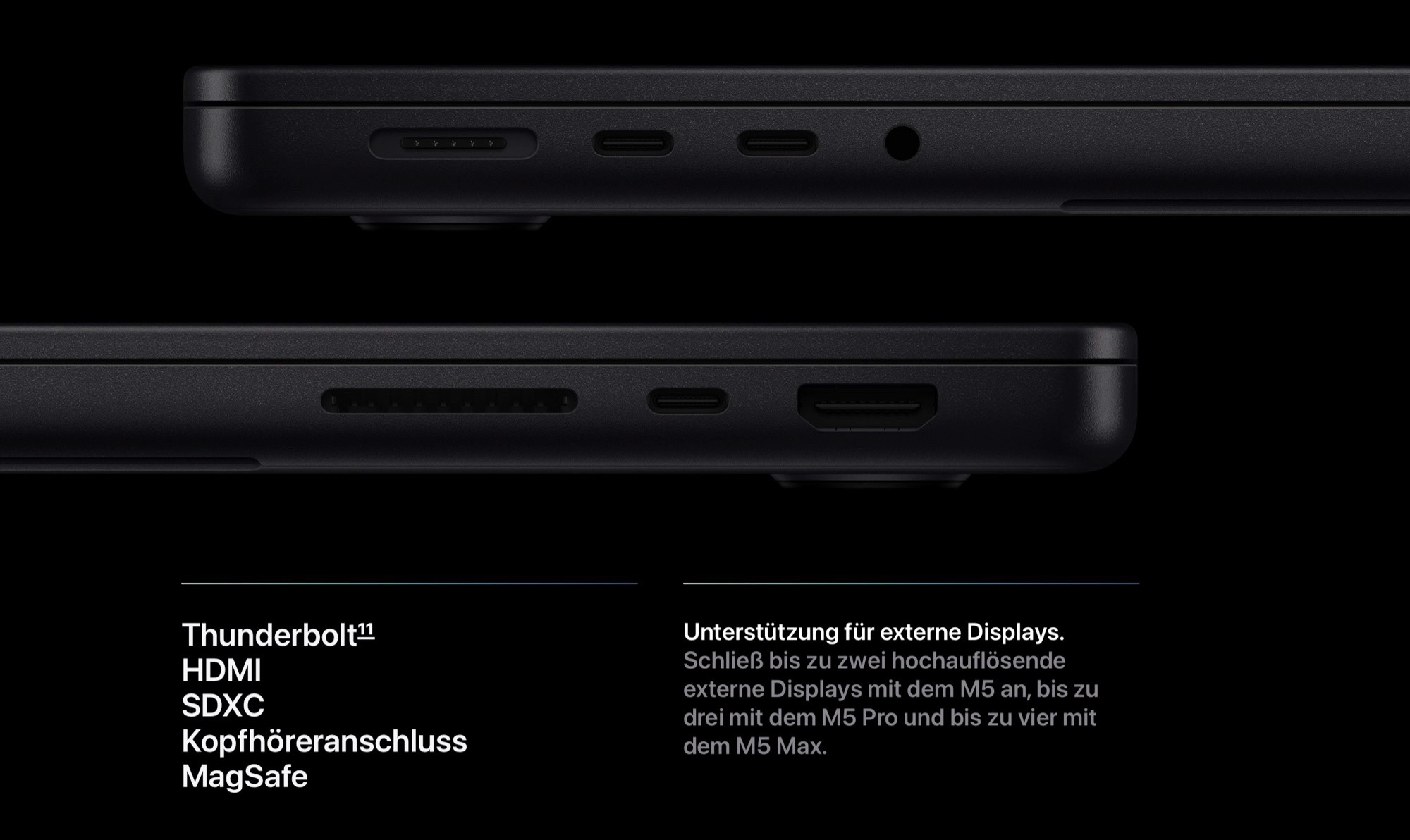 Apple bewirbt eine bis zu 2,5 Mal höhere CPU-Performance im Vergleich zum Apple M1 Max. Der Apple M5 Pro bietet laut Apple eine bis zu 30 Prozent höhere CPU-Performance und eine maximal 20 Prozent höhere GPU-Leistung als der Apple M4 Pro. Der Apple M5 Max soll 15 bis 20 Prozent schneller als sein Vorgänger sein. Das neue MacBook Pro unterstützt Thunderbolt 5, Wi-Fi 7 und Bluetooth 6. Apple verbaut wie gehabt sechs Lautsprecher und ein 14 Zoll oder 16 Zoll ProMotion-Display, das 120 Hz und 1.600 Nits erreicht.