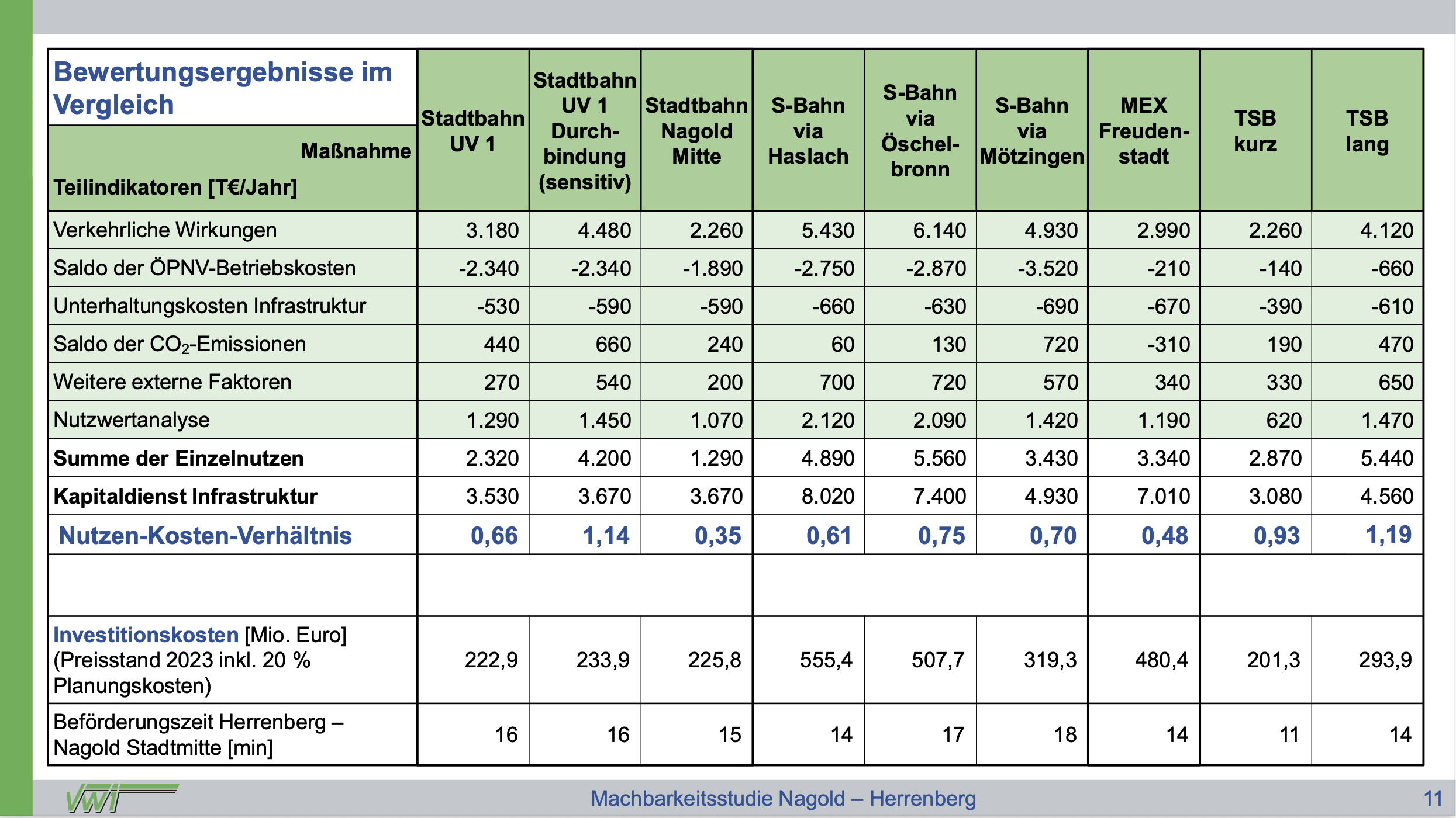 Es gibt aber eine Einschränkung. Das TSB kommt nur auf einen NKI von 1,19, wenn etwas mehr gebaut wird. Es braucht zusätzliche Haltestellen zur Feinerschließung im Nagoldtal (Rötenbach, Nagold Bahnhof, Stadtmitte, Steinberg und Iselshausen), wie es in der Vorlage heißt. Gleichzeitig steigt die Reisezeit von 11 auf 14 Minuten für die Strecke zwischen Nagold und Herrenberg, da die Strecke im Bogen nördlich in den Bereich Nagold hereingeführt wird.