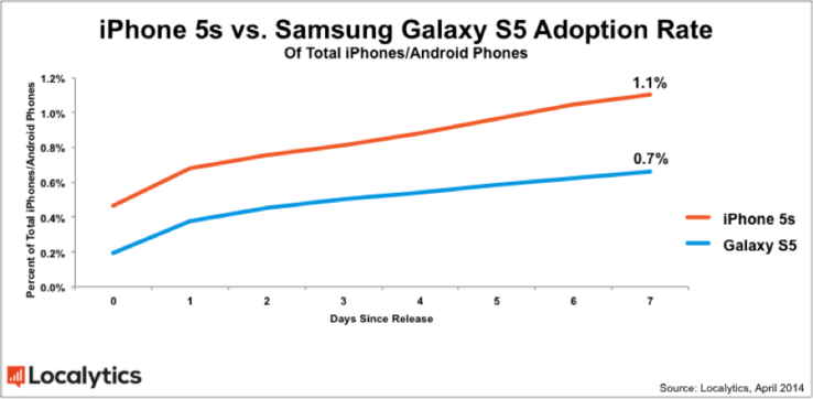 Am elften April war der weltweite Verkaufsstart des Galaxy S5. Sieben Tage später hat Samsung bereits 0,7 Prozent des Android-Handy-Marktes mit seinem neuen Flaggschiff erobert. Zu diesem Ergebnis kommt das Marktanalyse-Unternehmen Localytics. Sein Analyseprogramm ist in 25.000 Apps und auf 1,5 Milliarden Handys installiert und sammelt von dort aus fleißig Daten für Marktforschungszwecke – dergleichen geschieht, wenn man als Nutzer bestimmten zusätzlichen Berechtigungen bei der App-Installation zustimmt. Oberflächlich betrachtet konnte das iPhone 5S bei seiner Einführung einen noch größeren Erfolg für sich verbuchen. Eine Woche nach dem Marktstart von Apples aktuellem Vorzeige-Handy hatte das iPhone 5S bereits 1,1 Prozent des iPhone-Marktes beherrscht. Doch der Schein trügt.