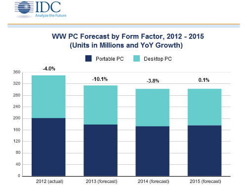Für 2013 rechnet IDC damit, dass der weltweite PC-Absatz um 10,1 Prozent von 349,4 Millionen (Jahr 2012) auf 314,2 Millionen PCs zurückgehen wird. Der Absatz von Notebooks soll in diesem Jahr um 11,2 Prozent einbrechen, sich allerdings in den folgenden Jahren erholen und bis 2017 wieder ein kleines Plus von 2,1 Prozent ausweisen.