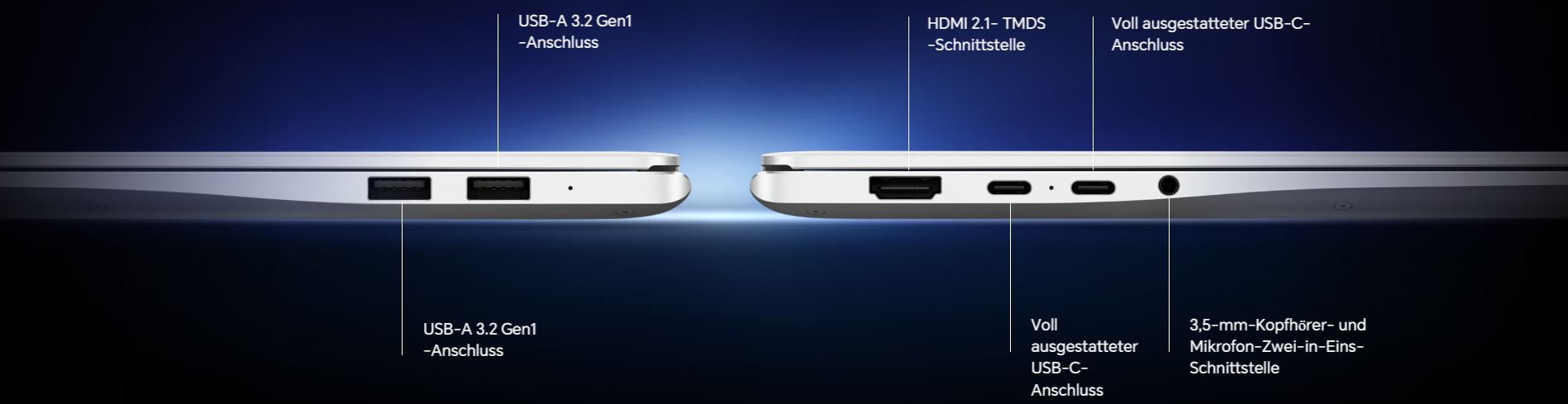 Verbaut sind zweimal USB Typ C mit vollem Funktionsumfang, an diesen Anschlüssen kann das Modell auch geladen werden. Die USB Typ C-Ports entsprechen dem USB 3.2 Gen 2-Standard und sollen Daten mit bis zu 10 GBit/s übertragen können, die beiden USB Typ A-Anschlüsse sind halb so schnell. HDMI 2.1 ist verbaut, die 3,5-Millimeter-Klinkenbuchse kann Headsets und damit Mikrofon und Kopfhörer gleichzeitig anschließen. Eine Full HD-Webcam zählt zur Ausstattung, dazu kommen zwei Lautsprecher und drei Mikrofone etwa für die Videotelefonie. Der Fingerabdrucksensor befindet sich im Einschalter, die hintergrundbeleuchtete lässt einen Ziffernblock vermissen. Der 92 Wh starke Akku soll eine Akkulaufzeit von rund 12 Stunden im Office-Einsatz erlauben.