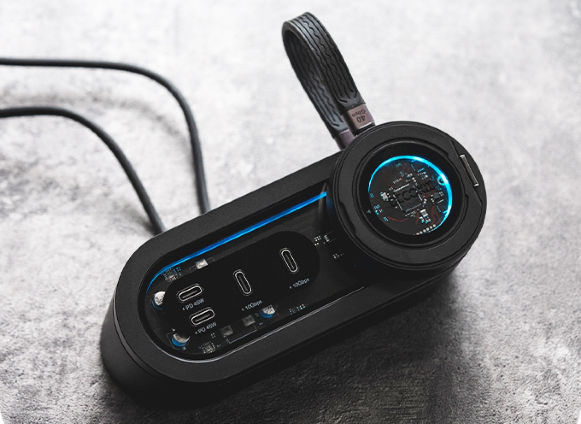 Der zugehörige USB-Hub bietet eine Ablagefläche für die SSD sowie einen USB-C-Port direkt hinter dieser Fläche, um die SSD mit einem kurzen Kabel zu verbinden. Dieses Design soll besonders praktisch sein, wenn eine SSD etwa genutzt wird, um 4K-Videos mit einem Smartphone aufzuzeichnen, und diese anschließend auf den PC übertragen werden. Der USB-Hub bietet vier weitere USB-C-Anschlüsse, darunter zwei mit 22,5 Watt Power Delivery, und zwei mit Datenraten bis 10 Gbit/s. Zur Stromversorgung wird ein 65 Watt USB-C-Netzteil benötigt, das nicht mitgeliefert wird.