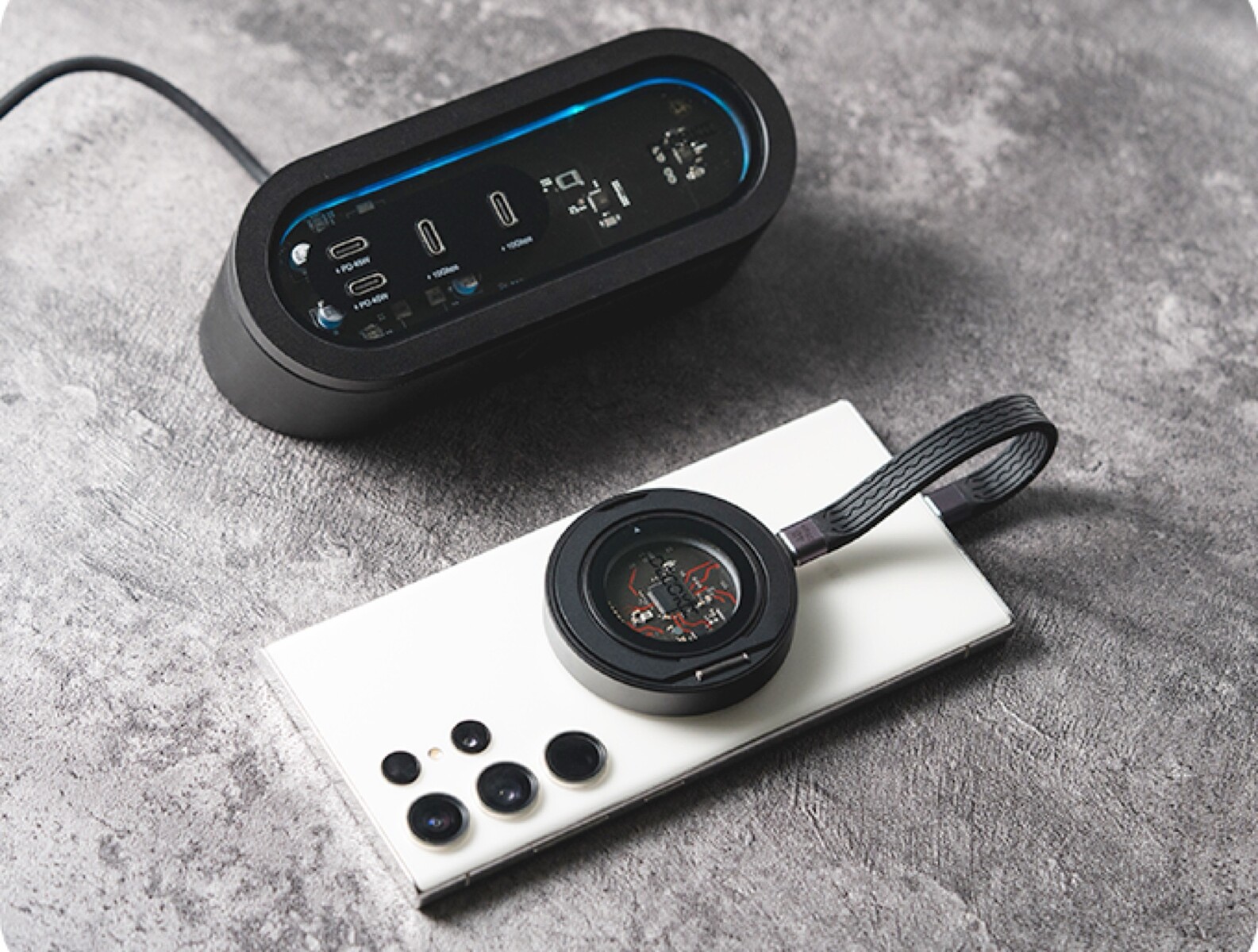 Die SSD ist durch ein Sichtfenster zu sehen, das mit einer RGB-LED-Beleuchtung versehen wird. Die SSD wird über USB-C 3.2 Gen 2 (10 Gbit/s) verbunden. Durch einen Magnetring hält die SSD an kompatiblen Smartphones wie dem Apple iPhone 16 Pro oder dem HMD Skyline, durch einen Magnet-Sticker kann die SSD aber auch auf Handhelds wie dem Steam Deck oder auf dem Display-Deckel eines Laptops befestigt werden.
