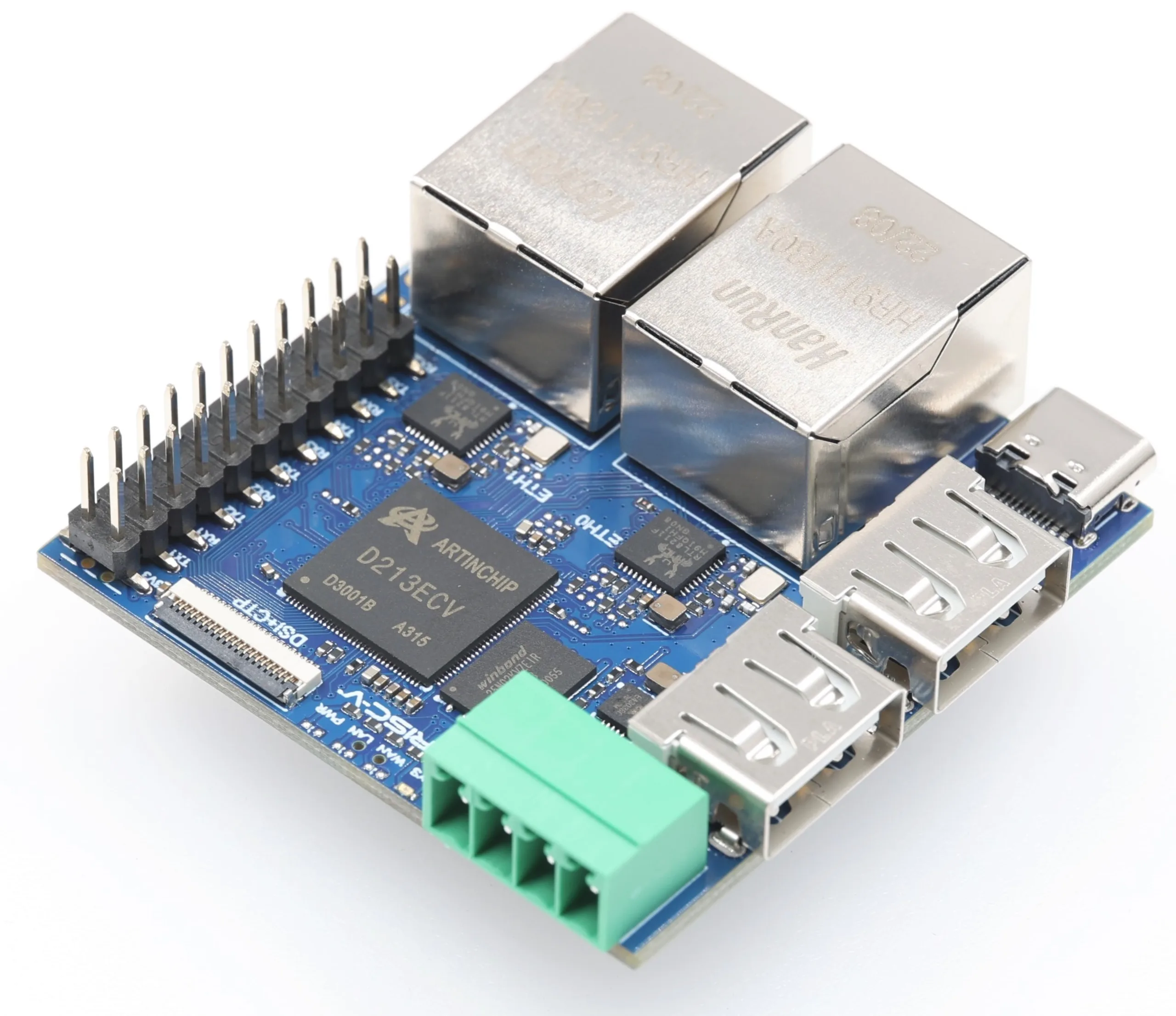 Nun kündigt sich ein neues Produkt des Herstellers an - und zwar ein ultrakompakter Router. Das Modell soll nur 5 x 5 Zentimeter messen und basiert nicht auf der ARM-, sondern auf der RISC-V-Architektur. Konkret soll ein ArtInChip D213ECV zum Einsatz kommen. Der Arbeitsspeicher soll 128 Megabyte groß sein, dabei wird 672 MHz schneller DDR3-Speicher genutzt. Der interne NAND-Flashspeicher ist 256 Megabyte groß. Für Entwicklerplatinen ganz üblich: Ein microSD-Kartenslot ist verbaut.
