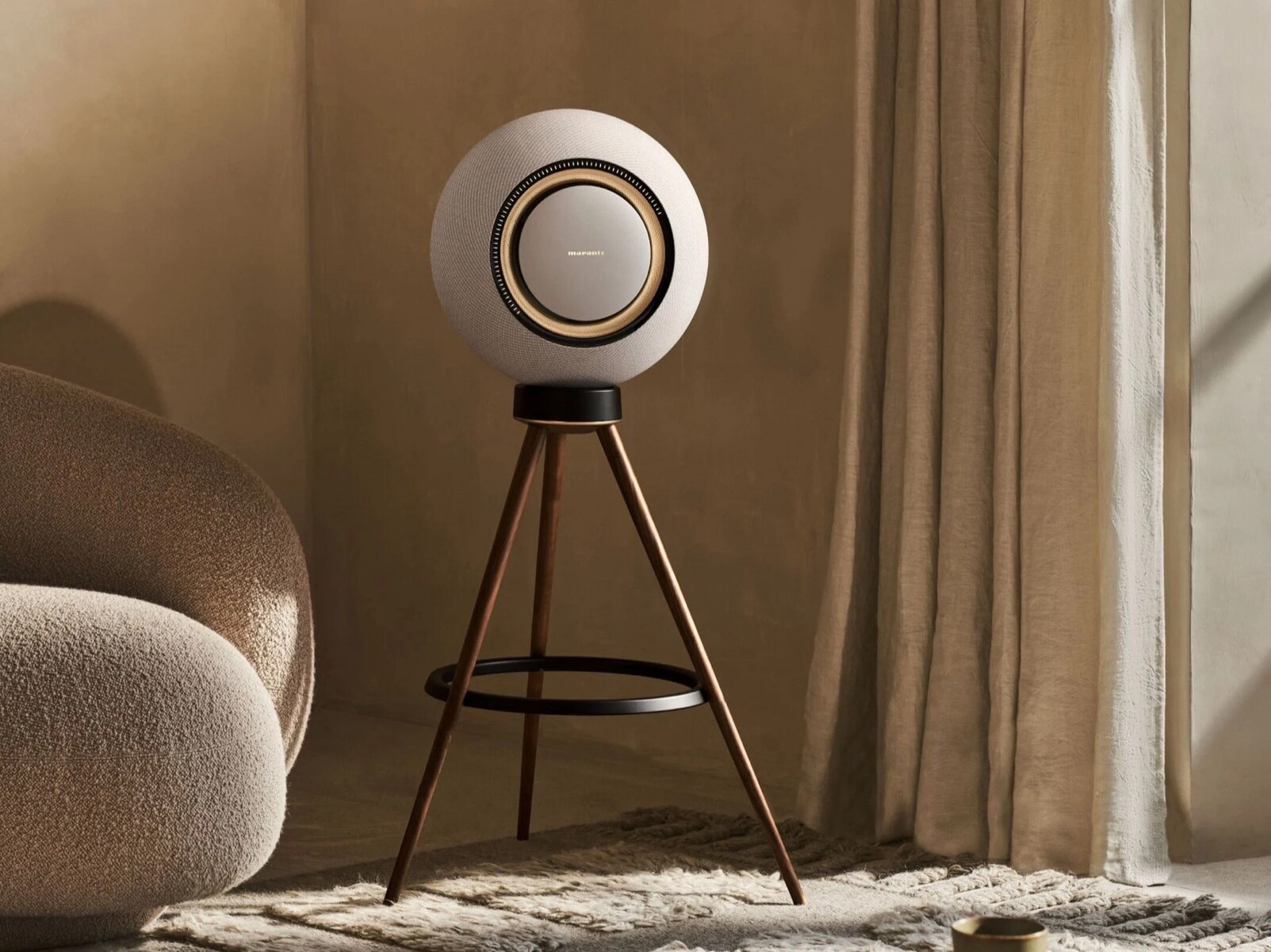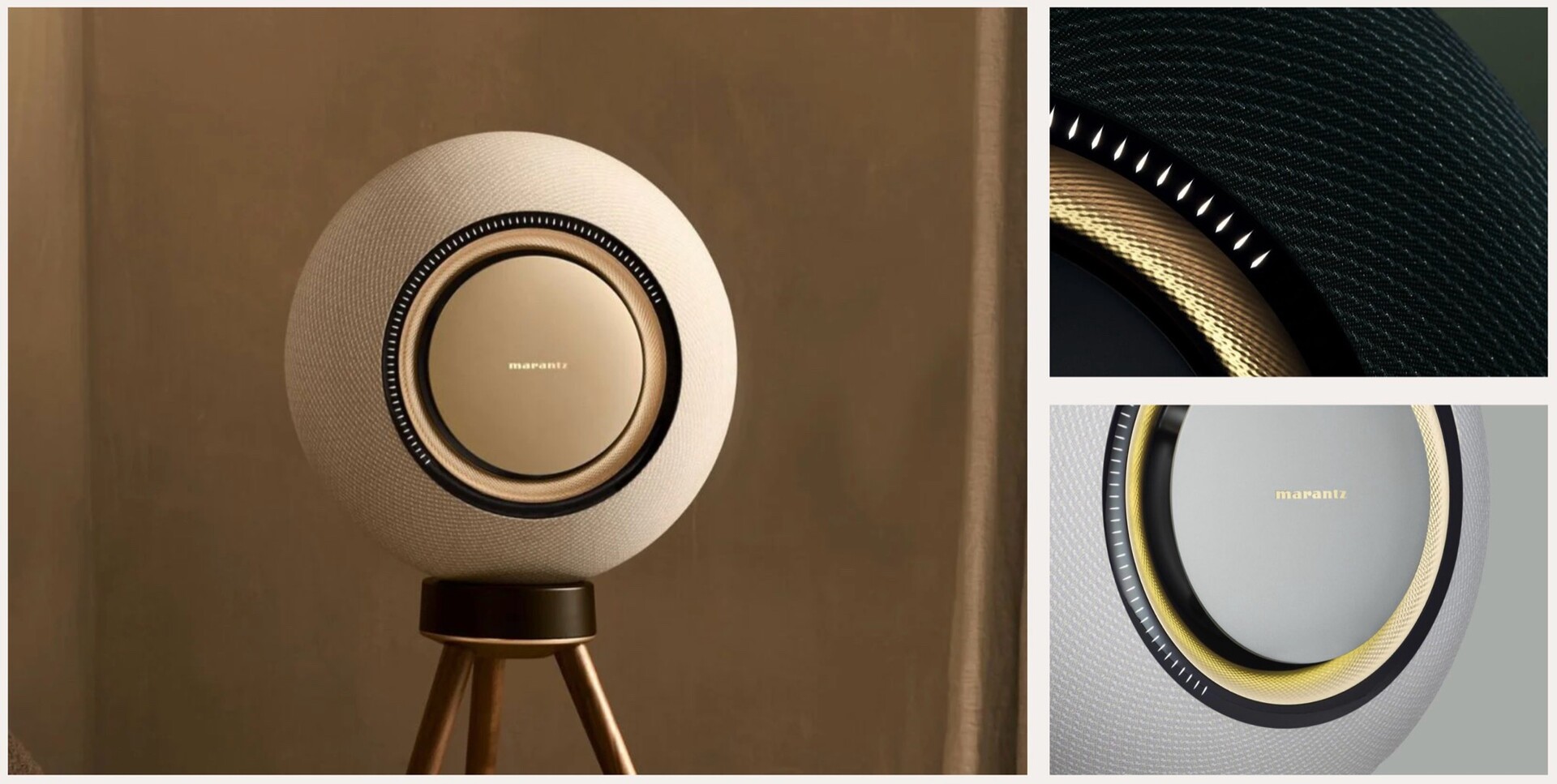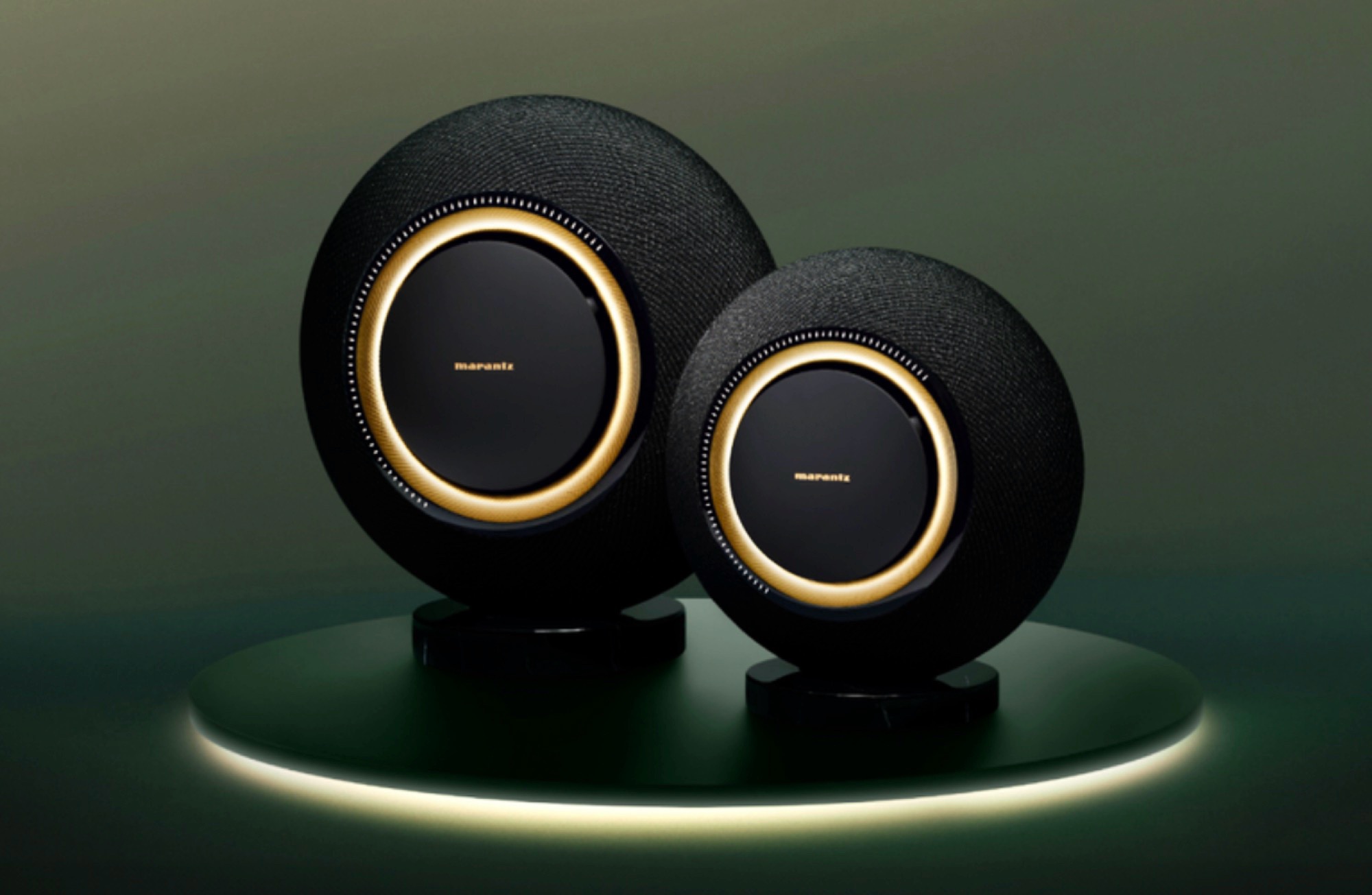 Der Marantz Horizon setzt auf ein ungewöhnliches, rundes Design mit einem Podest-förmigen Standfuß, wobei das kleinere Modell einen Durchmesser von knapp 39 Zentimetern bei einem Gewicht von 12,5 Kilogramm besitzt, die größere Version misst 53 Zentimeter und bringt 21,3 Kilogramm auf die Waage. Unabhängig von der Größe setzen die Lautsprecher auf eine "Marantz Radiance" Stoffabdeckung, die akustisch transparent, aber dennoch robust und langlebig sein soll.