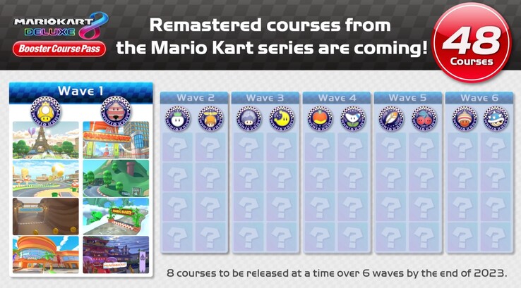 Nintendo entwickelt allerdings keine völlig neuen Strecken, stattdessen werden Strecken aus klassischen Spielen wie Mario Kart 64, Mario Kart DS, Mario Kart Wii, Mario Kart 7 und Mario Kart Tour neu aufgelegt und so angepasst, dass sie die neuen Features von Mario Kart 8 nutzen. Nintendo wird die Strecken in sechs Wellen bis Ende 2023 veröffentlichen, die jeweils zwei Cups, also acht Strecken beinhalten.