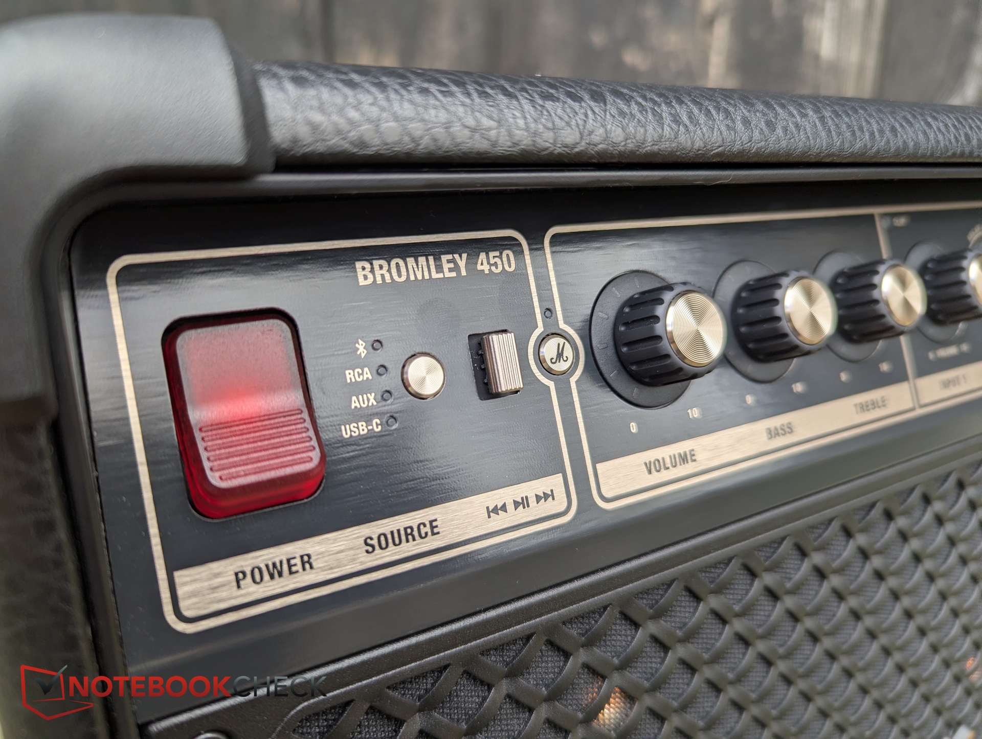 Wer den großen Bromley 750 schon gesehen hat, wird sich die Augen reiben, denn der 450 sieht quasi wie sein Zwilling aus - nur eben kleiner. Und das heißt coolen Marshall-Look statt China-made Blingbling. Bedeutet: Die sonst oft nackten Plastikoberflächen sind mit edlem PU-Leder überzogen, vorne sitzt das markante Metallgitter, an der oberen Front warten Messingknöpfe und -drehregler auf musikaffine Bedienfinger. Ergo macht der Bromley überall eine gute, stylische Figur. Ein zusätzlicher "M"-Button wartet wieder darauf via App belegt zu werden.
