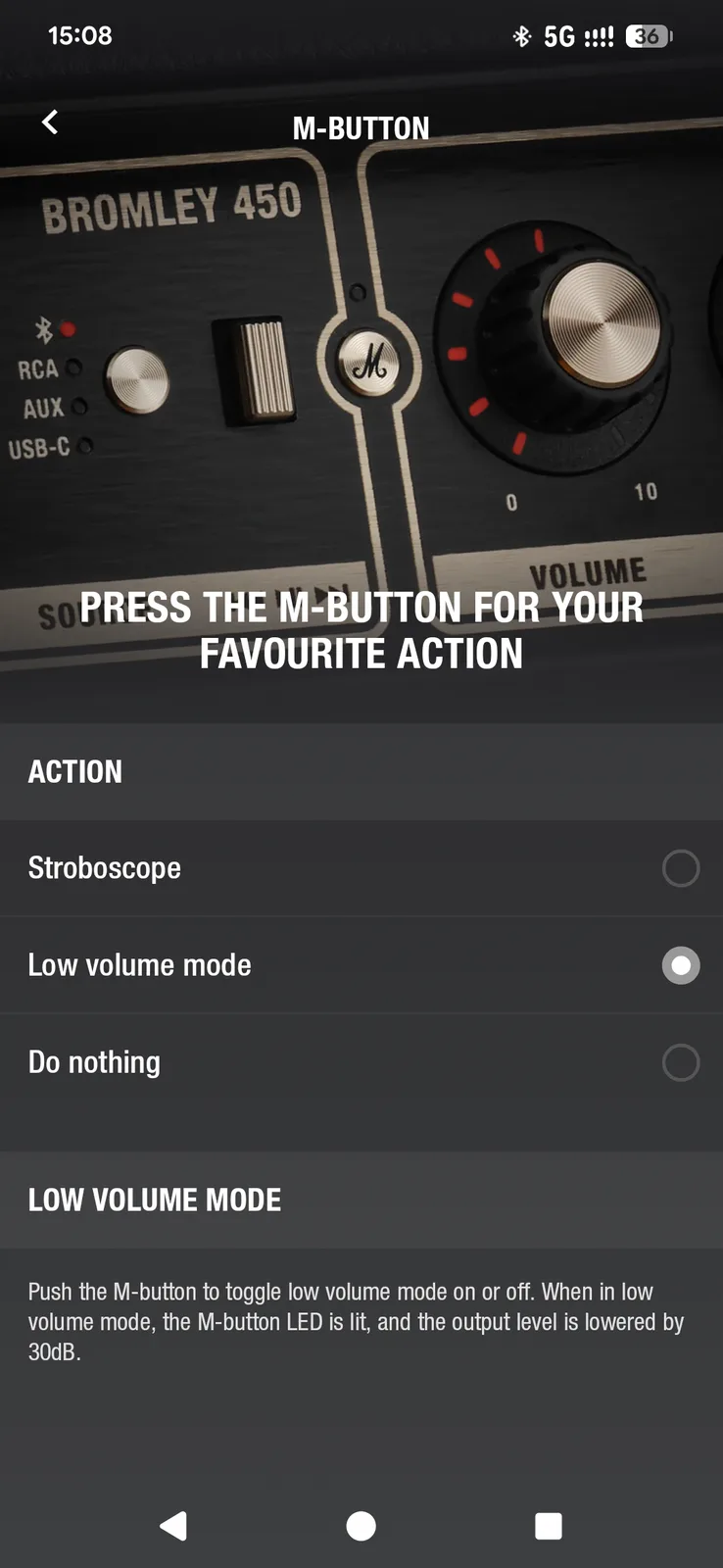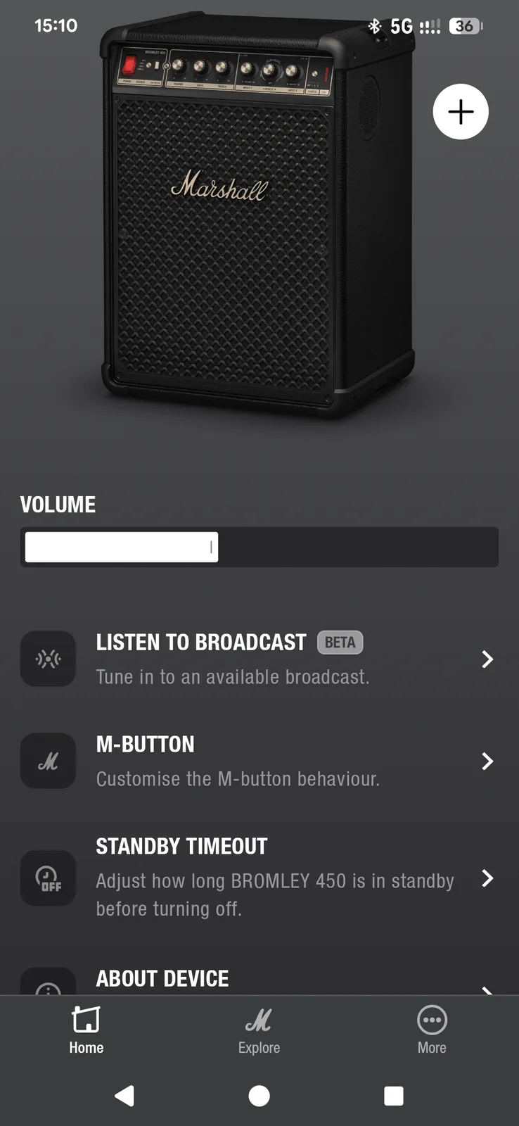 Der Bromley teilt sich die gleiche App mit den Marshall-Kopfhörern. Die Marshall Bluetooth App ist zwar schick und sehr übersichtlich, lässt aber an Funktionen vermissen. Lediglich für Auracast (mehrere Auracast-fähige Lautsprecher miteinander verbinden) und den M-Button benötigt man die App, zumal dem M-Button derzeit nur eine von zwei Funktionen zugewiesen werden kann. Außer der Lautstärke lässt sich sonst leider nichts aus der Ferne anpassen, kein Equalizer, keine Höhen oder der Bass, nada.
