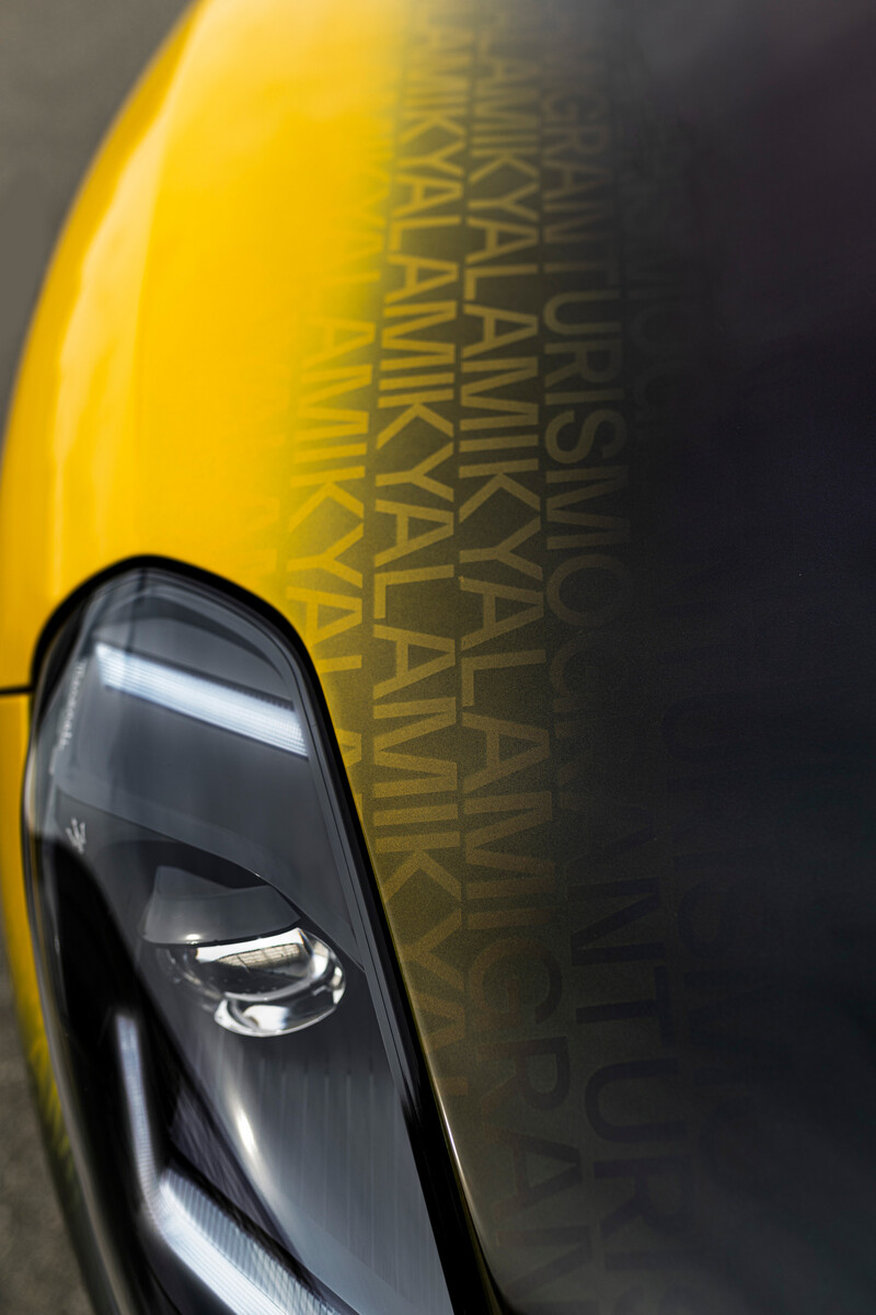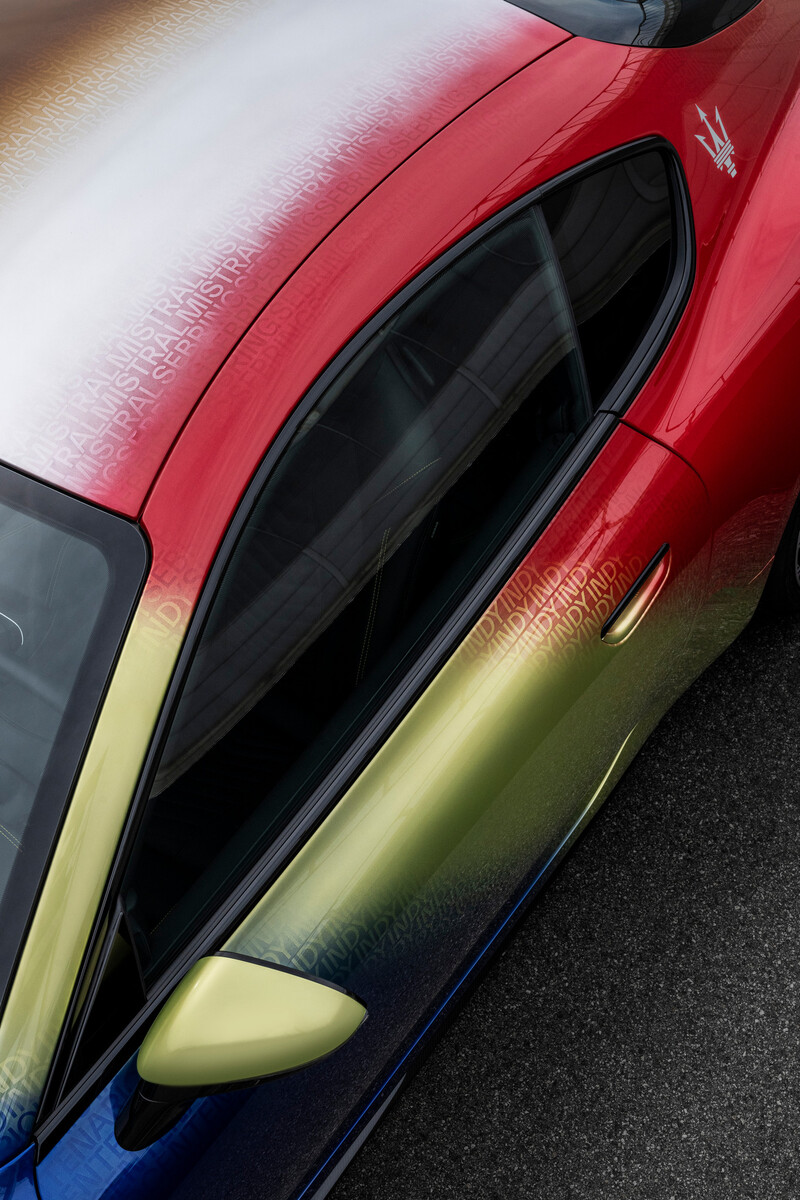 Der GranTurismo One Off Prisma wird vom Nettuno V6-Verbrennungsmotor angetrieben. Die Karosserie des One Off Prisma von Maserati wurde mit 14 chromatischen Farben und mehr als 8.500 handgemalten Buchstaben verziert, die die Namen von Maserati-Fahrzeugen zeigen. Zwei der Farben soll es künftig als Color-Optionen geben, die anderen 12 sind Farbtöne von GranTurismo-Modellen aus der Vergangenheit.