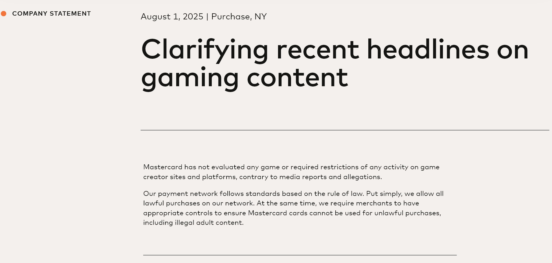 Das Kreditkartenunternehmen bestreitet, „irgendein Spiel bewertet oder Einschränkungen für irgendeine Aktivität auf den Seiten und Plattformen der Spieleentwickler verlangt zu haben”. Allerdings betont Mastercard, dass Händler „illegale Käufe, einschließlich illegaler Erwachseneninhalte”, verhindern müssen.