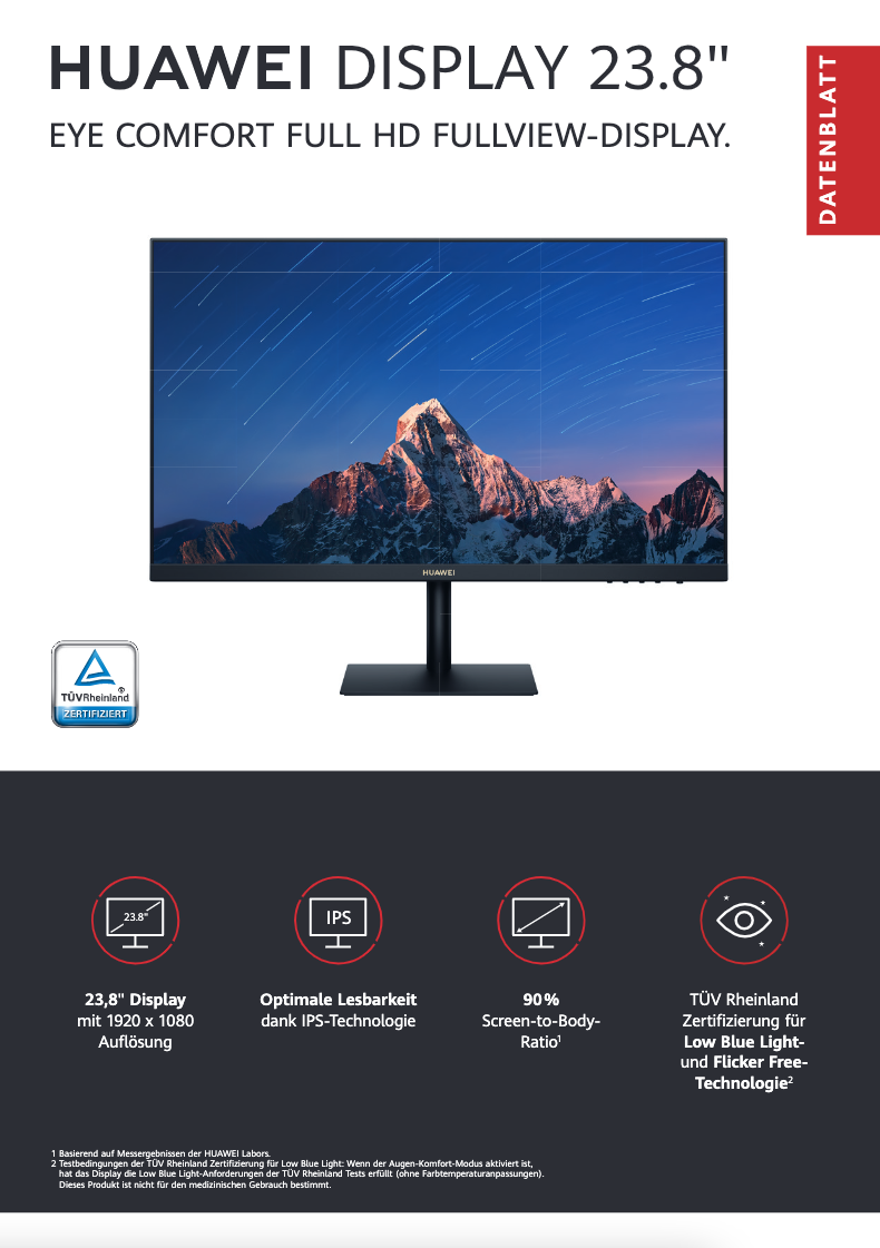 Das HUAWEI 23,8" Display kommt mit einer Auflösung von 1920 x 1080 direkt in Dein Wohnzimmer, Büro oder in jede andere Deiner Wohlfühloasen. Dank IPS-Technologie verfügt es über optimale Lesbarkeit aus allen (Lebens-)Lagen. Die schlanke Linie des HUAWEI 23,8" Monitors (90% Screen-to-Body-Ratio) wird sich elegant in Dein Zuhause einfügen. Aber nicht nur das Design ist was fürs Auge: die vom TÜV Rheinland zertifizierte Low Blue Light- und Flicker Free-Technologie ist es im wahrsten Sinne des Wortes auch. Den ohnehin schon tollen Preis von 159 Euro für einen Monitor unterbietet HUAWEI im Preorder-Monat vom 22.2. bis 21.3. nochmals um 30 Euro auf sensationelle 129 Euro.