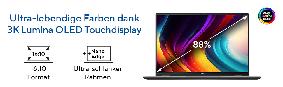 Das Gerät selbst ist mit einem hochauflösenden 3K Lumina OLED Touchdisplay im NanoEdge Design bestückt. Dieses stellt auf 16 Zoll Diagonale im 16:10-Format 2.880 x 1.860 Pixel dar und aktualisiert mit 120 Hz. Dank 0,2 ms Reaktionszeit ist das Gerät auch für Gaming gewappnet und kann dank 500 Nits Spitzenhelligkeit selbst im Freien genutzt werden.