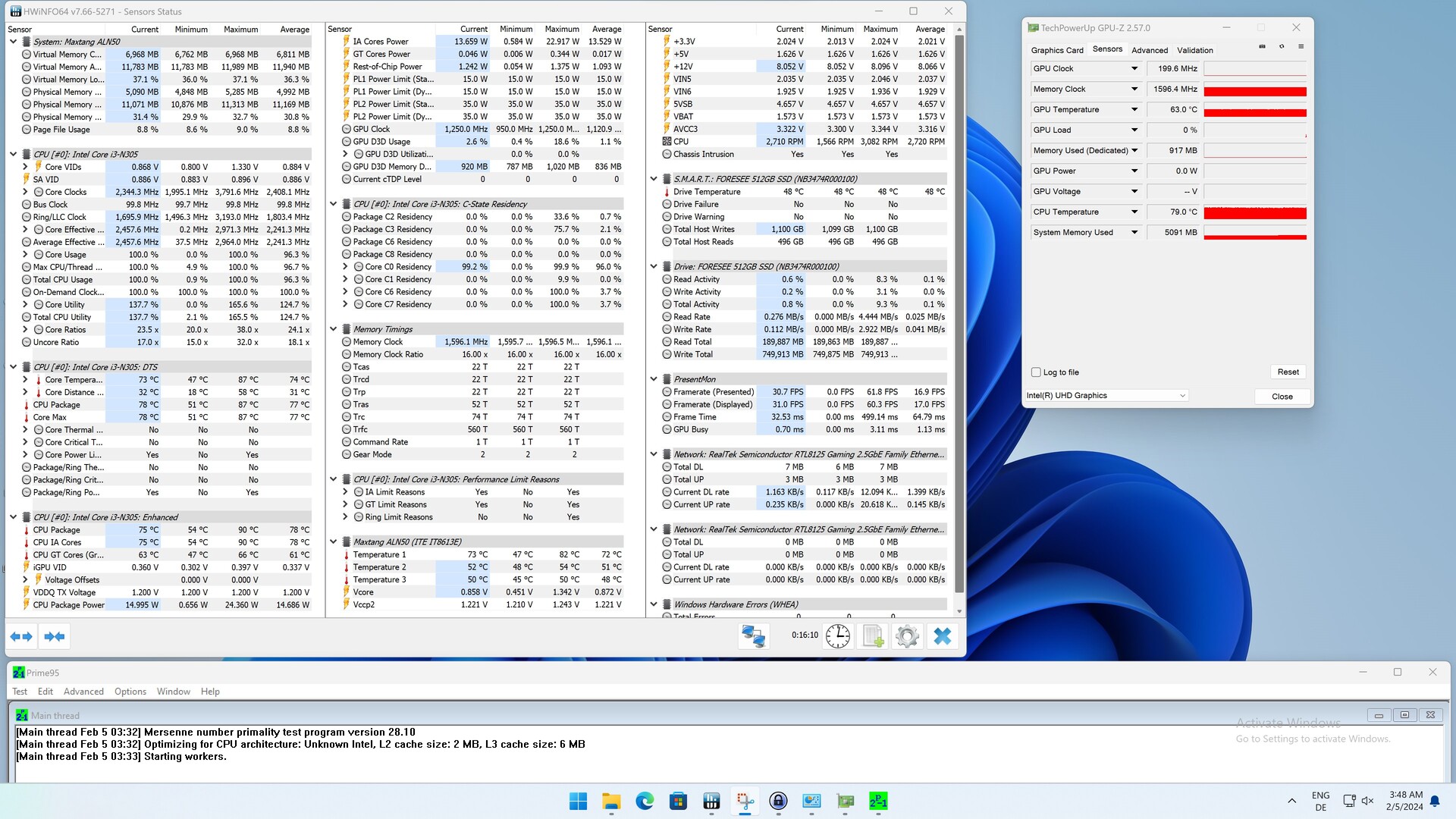 Das Gehäuse des Maxtang MTN-ALN50 erwärmt sich nur geringfügig. Beim Prozessor selbst sehen wir beim Stresstest maximal 90 °C, welche nur direkt nach dem Start des Stresstests erreicht werden. Im weiteren Verlauf pendelt sich die CPU-Temperatur bei knapp unter 80 °C ein. Wir sehen aber auch, dass der PL2-Wert (35 Watt) nicht erreicht werden kann. Zu schnell steigt die Temperatur und in der Spitze erreicht der Intel Core i3-N305 nur 24 Watt, bevor dann die Leistung auf 15 Watt gesenkt wird. Damit arbeitet das SoC dann aber innerhalb der Spezifikationen, welche Intel für den Core i3-N305 vorgibt.