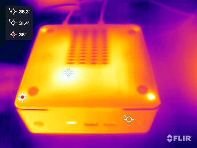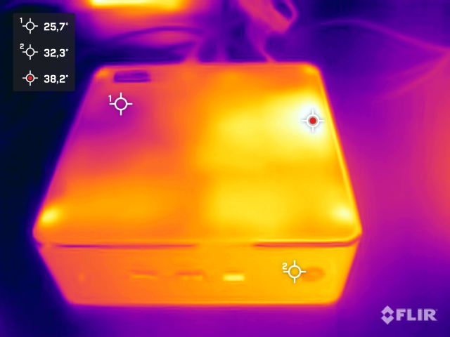 Das Gehäuse des Maxtang MTN-FP750 erwärmt sich im Leerlauf und unter Last nur geringfügig. Als Hotspot sehen wir auf der Oberseite nur knapp 40 °C, wenngleich auf der Unterseite nicht einmal 35 °C erreicht werden. Das SoC wird dabei schon deutlich wärmer, wenngleich wir mit knapp 80 °C im grünen Bereich bleiben. Zudem hat der Hersteller im BIOS eine maximale Temperatur von 90 °C definiert. Diese erreichen wir bei dem voreingestellten Power-Limit von 35 Watt ohnehin nicht.