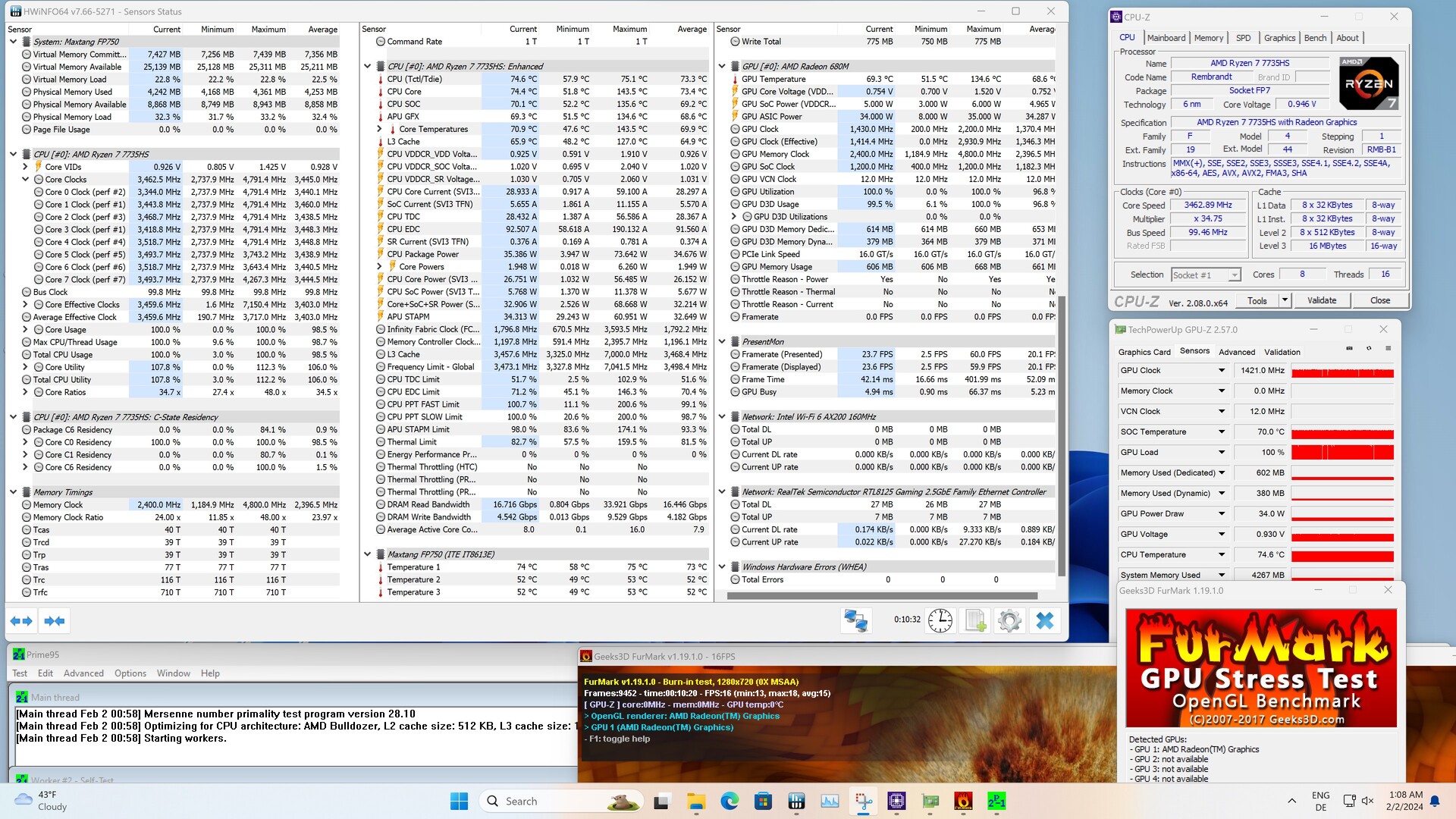Der AMD Ryzen 7 7735HS ist ein relativ moderner 8-Kern-Prozessor und gehört zur Rembrandt-Serie. Zu den aktuellsten Prozessoren von AMD zählt das Zen3-SoC jedoch nicht mehr. Immerhin kann der Prozessor 16 Threads parallel verarbeiten, was eine gute Multi-Thread-Performance verspricht. Im Leistungsvergleich kann sich unser Maxtang MTN-FP750 nur den vorletzten Platz sichern. Der Grund ist hier die Leistungsbegrenzung des AMD Ryzen 7 7735HS, welche bei 35 Watt liegt.