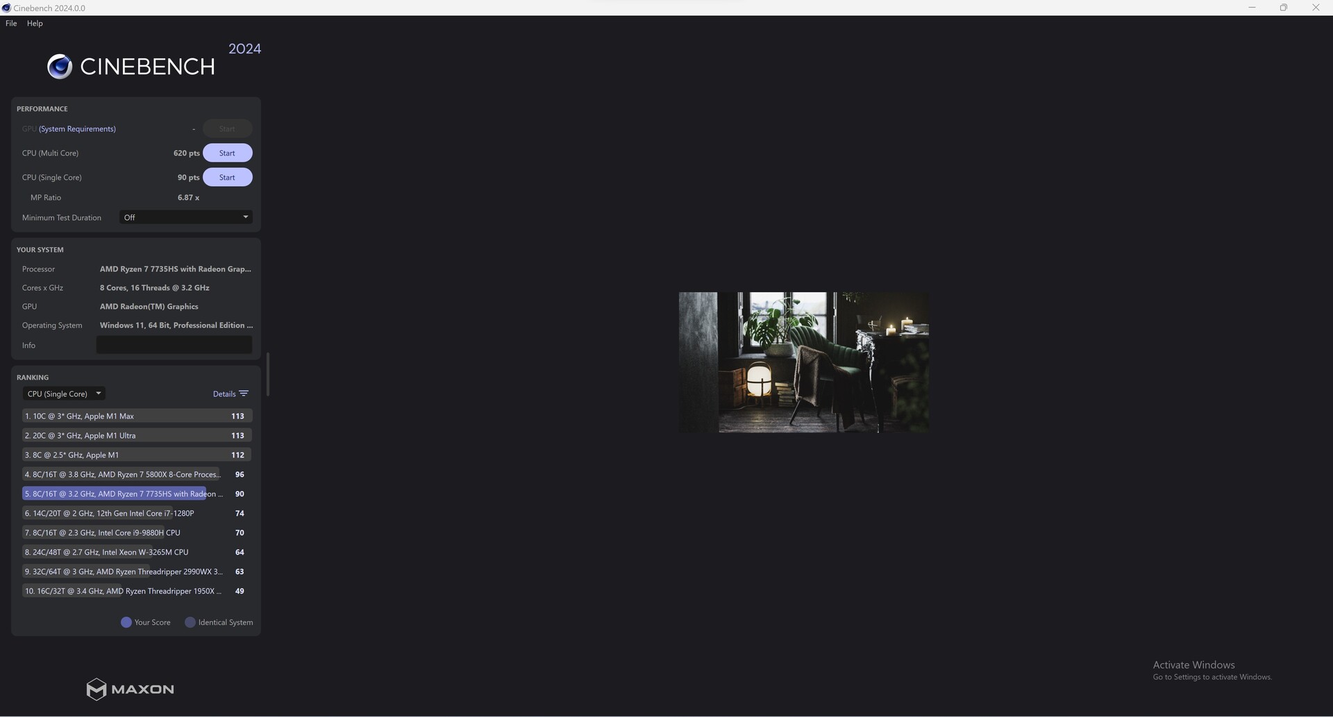 Cinebench-Ergebnisse im Auslieferungszustand (PL1 und PL2 = 35 Watt)