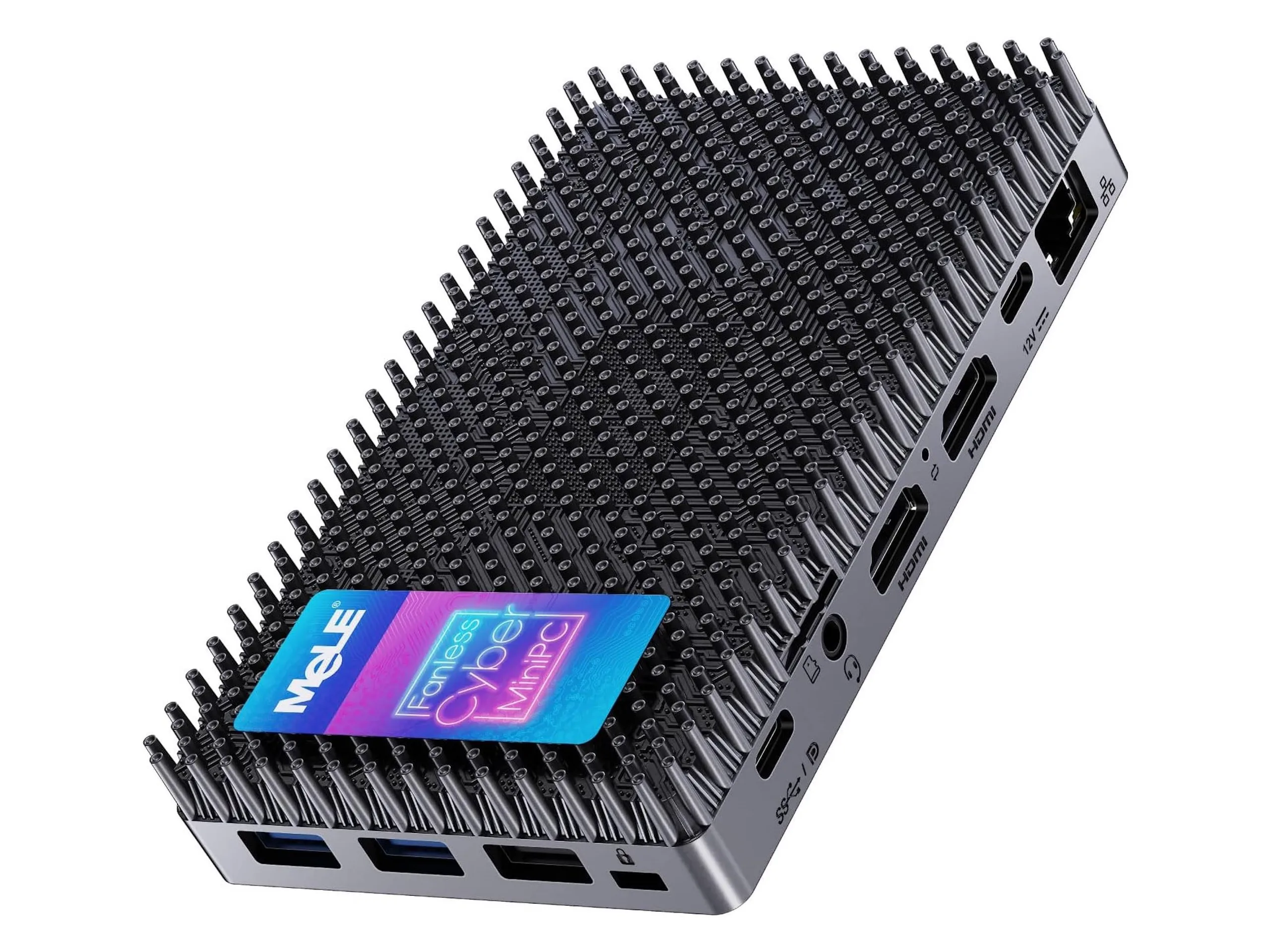 Es handelt sich um einen passiv gekühlten Mini-PC. Dabei nutzt der Hersteller nicht nur Kühlrippen, sondern sozusagen zahlreiche, kleine Stäbe. Inwieweit dieses Design bei der Kühlung wirklich überlegen ist, lässt sich aus der Ferne nicht einschätzen, sollte aber auch nicht unbedingt angenommen werden. Ausgestattet ist der MeLE Cyber X1 mit dem Intel N150 und damit einem in der Leistung durchaus limitierten Rechenchip mit vier Rechenkernen, welcher auch kein Hyperthreading unterstützt. Verbaut ist ein mit 16 Gigabyte zumindest für die typischen Anwendungszwecke - also etwa dem Digital Signage oder der Medienwiedergabe im privaten Bereich - ordentlich dimensionierter Arbeitsspeicher. Die verbaute M.2 2280-SSD bietet eine Kapazität von 512 Gigabyte.