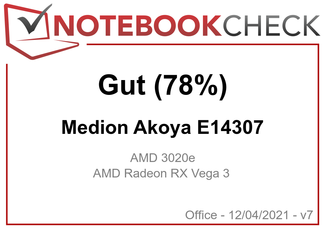 | 78.4 % v7 (old) | 04 / 2021 | Medion Akoya E14307 3020e, Vega 3 | 1.5 kg | 18 mm | 14.00" | 1920x1080 | |