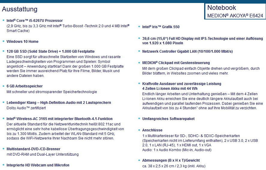 Das Medion Akoya E6424 (MD 99850) ist ab Mittwoch nächster Woche (4. Mai), auch bei Aldi Süd in den Filialen zu einem Preis von knapp 600 Euro erhältlich. Ab diesem Donnerstag (28. April) verkauft Aldi Nord das E6424 (MD 99850) zum gleichen Preis. Das rund 2,3 Kilogramm schwere 15,6-Zoll-Notebook arbeitet mit einem in 14-nm-Fertigung produzierten Intel Core i5-6267U Dualcore-Prozessor der Generation Skylake. Die Grafikausgabe übernimmt die IGP Intel Iris Graphics 550.