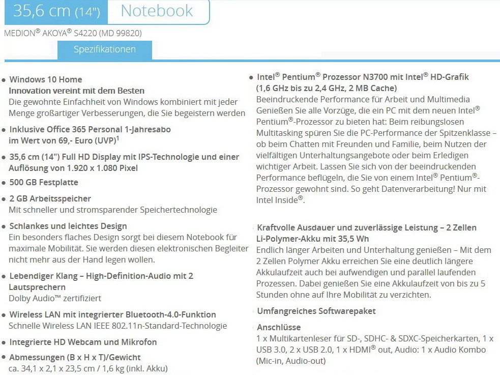 Das Medion Akoya S4220 (MD 99820) ist ab Donnerstag, den 31. März auch bei Aldi Nord in den Filialen zu einem Preis von rund 350 Euro erhältlich. Das rund 1,6 Kilogramm schwere 14-Zoll-Notebook misst 341 x 235 x 21 Millimeter und integriert ein 14-Zoll-Display mit einer Full-HD-Auflösung von 1.920 x 1.080 Pixel. Als Rechenhirn arbeitet im Akoya-Notebook ein energiesparender Intel Pentium N3700 Quadcore-Prozessor inklusive einer HD Graphics (Braswell) IGP.