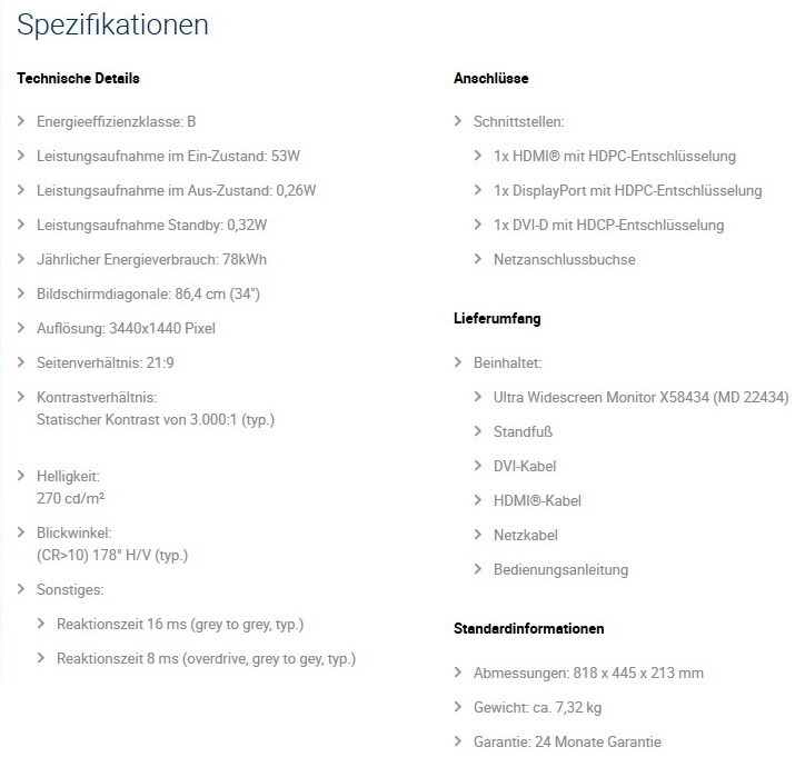 Der Medion Akoya X58434 (MD 22434) präsentiert sich in einem schlanken Designgehäuse mit Abmessungen von 818 x 445 x 213 Millimetern und einem Gewicht von 7,32 Kilogramm. Der große Curved-Ultra-Widescreen-Monitor verbraucht im Betrieb 53 Watt. Medion nennt für den X58434 (MD 22434) eine Helligkeit von bis zu 270 cd/m² und einen statischen Kontrast von 3.000:1.