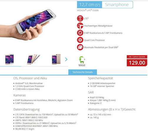 Das Medion E5006 (MD60227) soll ab dem 23. Februar in den Aldi-Nord-Filialen Käufer finden. Medion rüstet das E5006 (MD60227) mit einem 5 Zoll HD-Display (IPS), Dual-SIM-Funktion und einem hochwertigen Metallgehäuse in den Farboptionen Silber oder Amber-Gold zu einem Preis von rund 130 Euro aus.