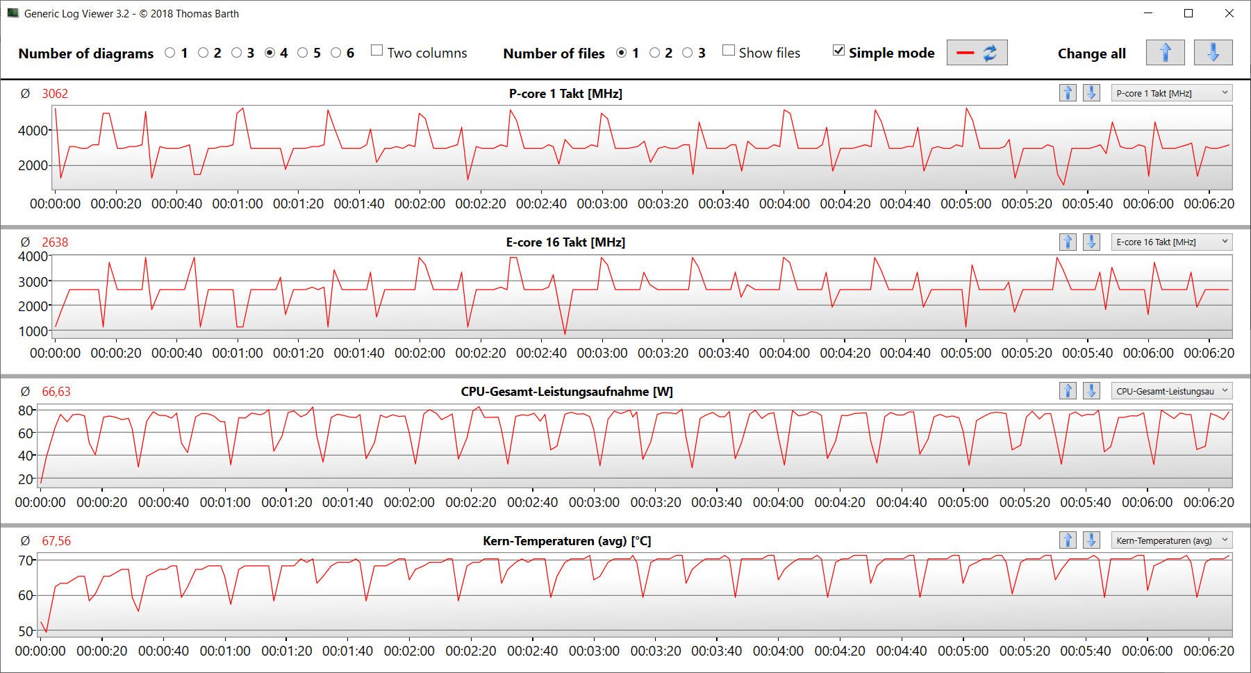 Der Stresstest (Prime95 und Furmark im Dauerbetrieb) stellt ein Extremszenario zur Überprüfung der Systemstabilität unter Volllast dar. Die CPU beginnt den Test mit hohen Taktraten (P: 4 GHz, E: 3,3 GHz), die GPU geht mit 1 bis 1,5 GHz zu Werke. Nach etwa 5 Minuten sinkt der CPU-Takt schrittweise auf 2 GHz (P-Kerne) bzw. 1,8 GHz (E-Kerne), gleichzeitig steigt der GPU-Takt auf bis zu 2,3 bis 2,4 GHz.