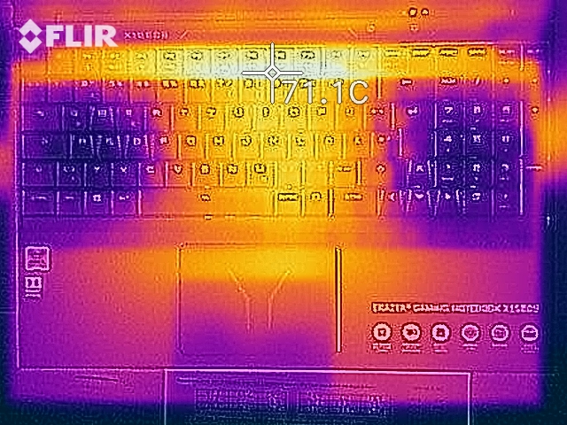 Das Notebook erwärmt sich teilweise sehr deutlich. Während des Stresstests registrieren wir an mehreren Messpunkten Temperaturen jenseits von 60 Grad Celsius. Das Gerät sollte unter Last nicht auf den Oberschenkeln abgestellt werden. Im Leerlauf liegen die Werte im grünen Bereich.