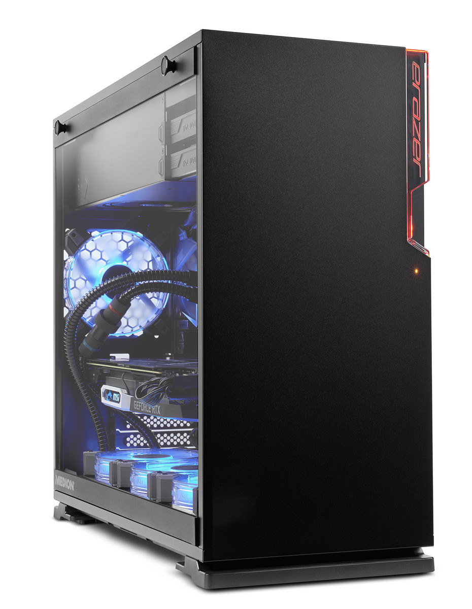 Als weiteres Highlight spendiert Medion seinem Erazer-Gamer eine Alphacool Eisbaer 360 LT Wasserkühlung. Dank dem Gehäuse mit Glasseitenteil ist der Medion Erazer Gaming-PC auch optisch ein Hingucker. Gleich sechs beleuchtete In Win Polaris RGB-Lüfter sind über die MSI Mystic-Light-Software steuerbar. Der Medion Erazer X67099 kostet rund 1.800 Euro und ist ab sofort im Medion-Shop und bei Händlern erhältlich.