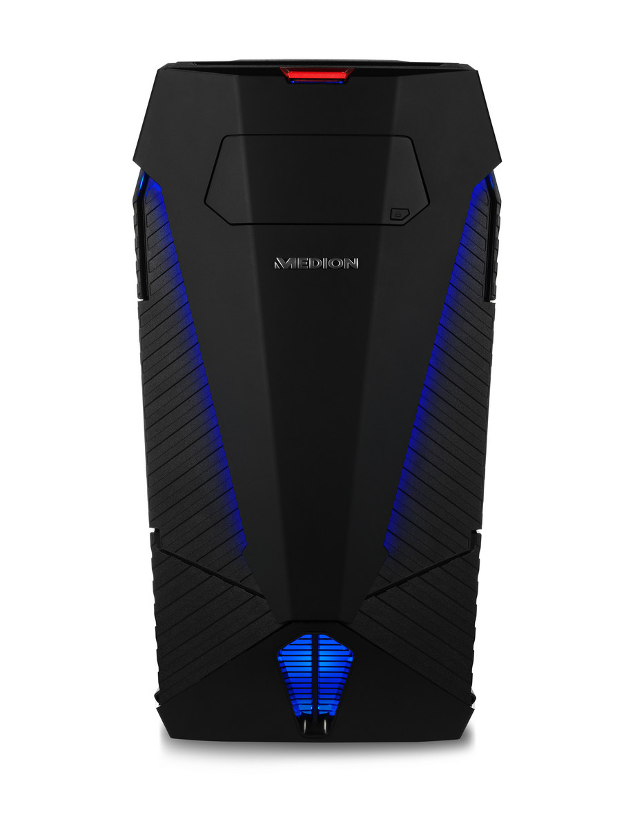 Der Medion Erazer P66001 nutzt ebenfalls einen Intel Core i5-8400. Als Grafikkarte spendiert Medion dem Windows-PC aber eine Nvidia GeForce GTX 1050 Ti mit 4 GB GDDR5 als Grafikspeicher. Für schnelle Programmstarts sorgt im Erazer P66001 eine 256 GB große PCIe-SSD. Als Arbeitsspeicher ist ebenfalls 8 GB DDR4 an Bord. Das kompakte und mattschwarze Micro-ATX-Gehäuse verfügt über blau leuchtende LED-Elemente an der Front.