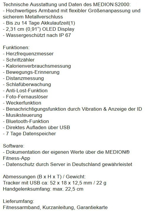 Ausgewertet werden die vom S2000-Armband aufgezeichneten Daten bequem mit der kostenlosen Medion Fitness App für Android und iOS. Besonders großen Wert legt Medion laut eigenen Angaben auf den Datenschutz: Die mit dem Fitnesstracker ermittelten Fitnessdaten werden lokal auf dem Smartphone oder Tablet gespeichert. Wenn auf Wunsch auch eine Sicherheitskopie in der Cloud hinterlegt werden soll, erfolgt dies auf einem deutschen Server.