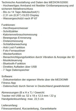 Zum komfortablen Ablesen von Uhrzeit, Akkustand und Datum besitzt das Medion S2000 Fitnessband ein 0,91-Zoll-OLED-Touchdisplay, auf dem sich der Nutzer - je nach Aktivität - auch Herzfrequenz, Distanz, Schritte und Kalorien anzeigen lassen kann. Von einem via Bluetooth gekoppelten Smartphone lassen sich Anrufe oder Nachrichten anzeigen, auf die parallel auch per Vibrationssignal hingewiesen wird.