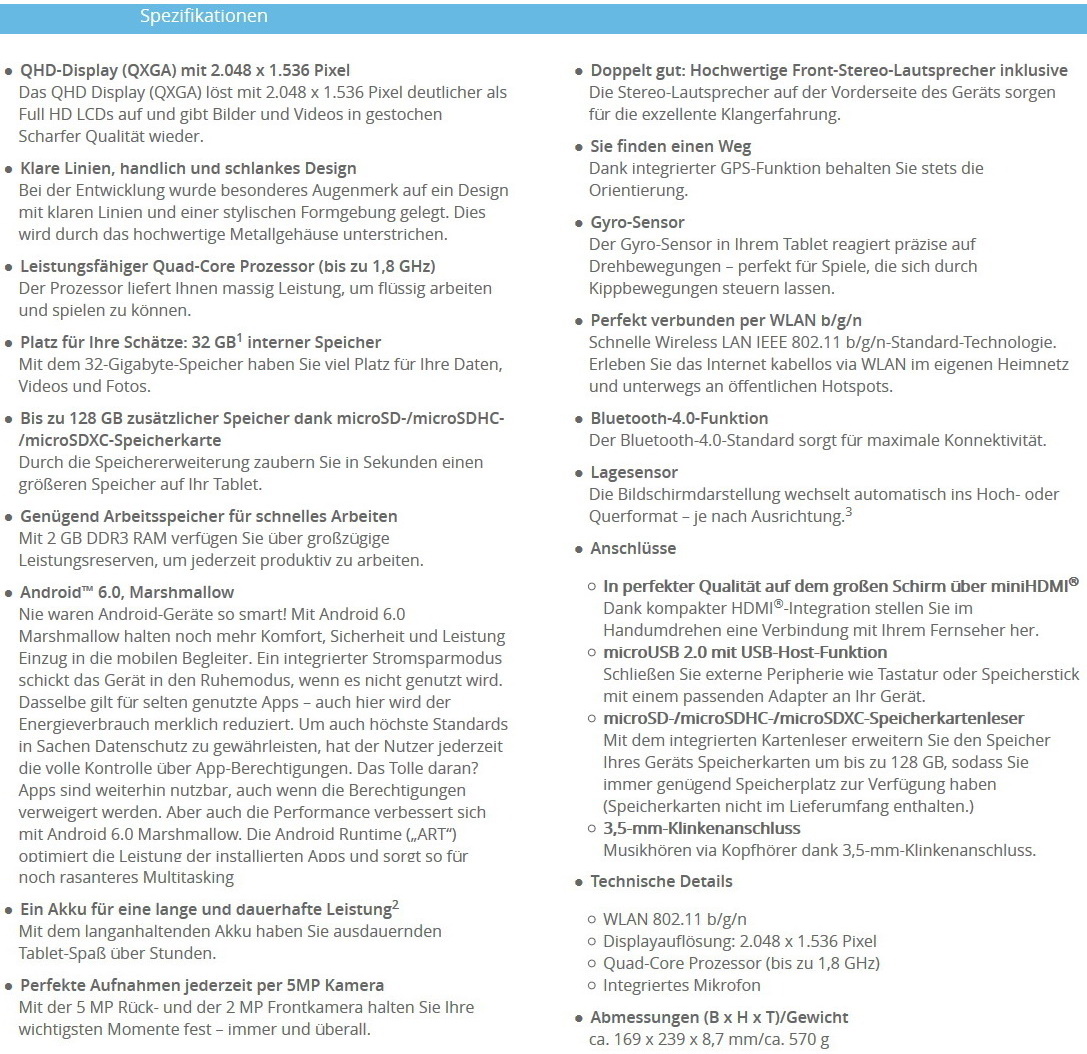 Das Medion Lifetab P9702 (MD 60201) punktet mit einem hochwertigen, 570 Gramm schweren Metallgehäuse, Quadcore-Prozessor vom Typ Rockchip RK3288, dem 2 GB Arbeitsspeicher (RAM) und 32 GB interner Speicher zur Verfügung stehen, sowie einem Display, das mit 2.048 x 1.536 Pixeln im 4:3-Format die gleiche Auflösung wie das iPad Pro 9,7 Zoll bietet.