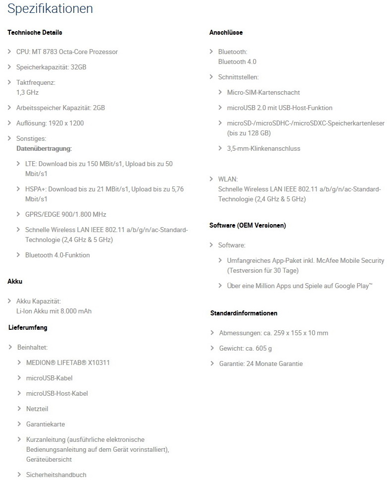 Angetrieben wird der Medion Lifetab X10311 (MD 60654) Tablet-PC von einem MediaTek MT8783 8-Kern-Prozessor, dem eine integrierte ARM Mali-T720 als GPU sowie 2GB RAM und 32 GB interner Systemspeicher zur Seite stehen. Dank des eingebauten LTE-Modems können Nutzer auch unterwegs auf Reisen, bei entsprechender Netzabdeckung, mit hoher Geschwindigkeit mobil im Internet surfen.