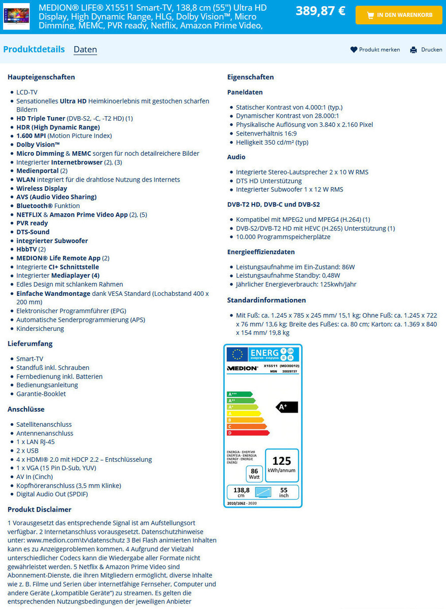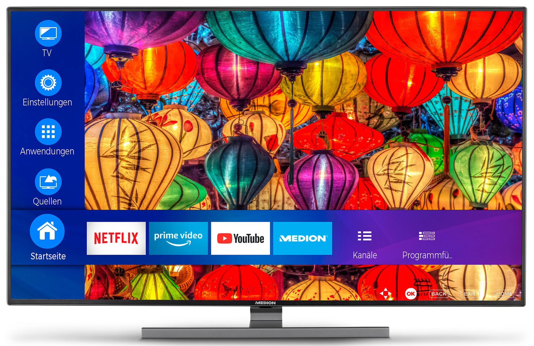 Ebenfalls brandfrisch im Fernseher-Sortiment von Medion ist der Life X15511. Auch der X15511 bietet Ultra HD, Micro Dimming und MEMC sowie Dolby Vision, HDR, einen MPI von 1.600 und einen integrierten Subwoofer mit DTS-Sound. Vorinstallierte Apps wie Netflix und Amazon Prime Video, mit denen bei den Diensten erhältliche Inhalte direkt auf dem Smart-TV angesehen werden können, sorgen für eine riesige Filmauswahl.
