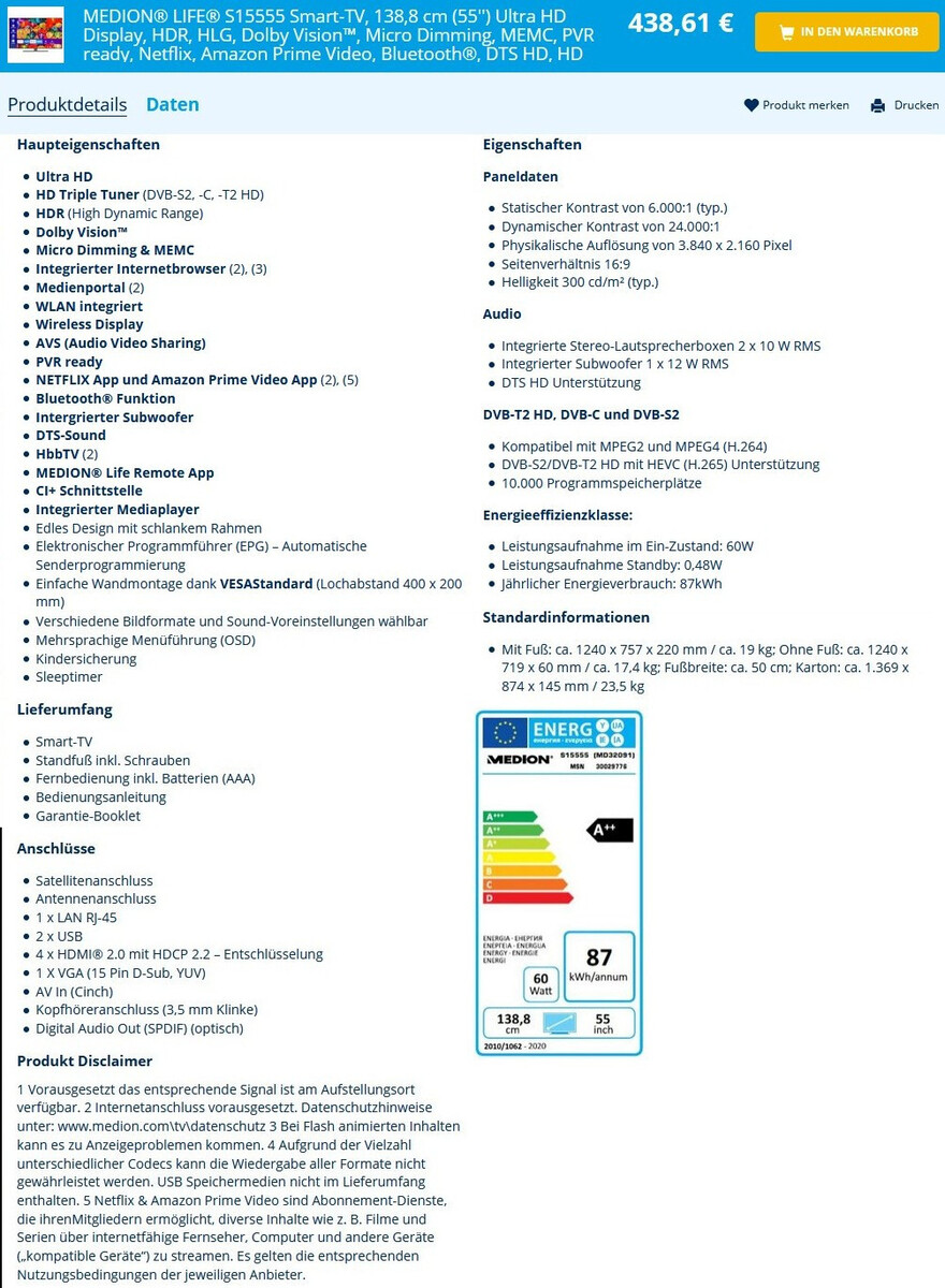 Zusätzlich bieten die neuen 55-Zoll-TVs von Medion integriertes WLAN, AVS (Audio Video Sharing), Wireless Display, einen HD Triple-Tuner, um digitales Fernsehen in HD-Qualität via Kabel, Satellit und terrestrisch via DVB T2-HD zu empfangen, eine CI+-Schnittstelle sowie unter anderem bis zu vier HDMI 2.0-Anschlüsse mit HDCP 2.2-Entschlüsselung und 2x USB. Alle Smart-TVs der neuen Medion TV-Linie lassen sich auch bequem mit der kostenlosen Medion Life Remote App per Smartphone oder Tablet steuern.