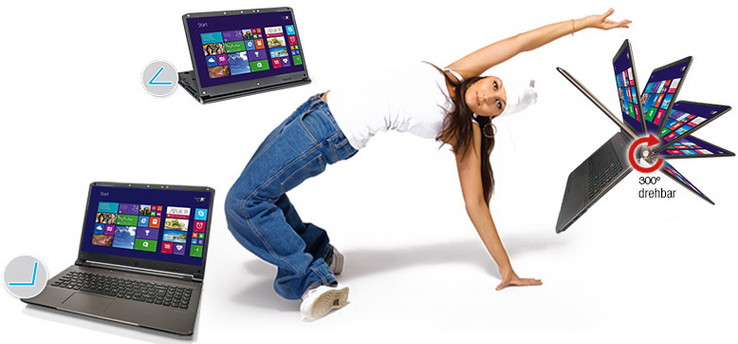 Die klassische Notebook-Position eignet sich insbesondere für produktive und kreative Tätigkeiten wie das Erstellen von Texten oder Präsentationen. Die notwendige Leistung liefert ein Intel Core i3-4010U Haswell-Prozessor (1,7 GHz) mit 4 GByte Hauptspeicher. Als Speicher für Daten und Multimedia wie Fotos oder Musik steht eine 500 GByte große Hybrid-Festplatte als SSHD zur Verfügung.