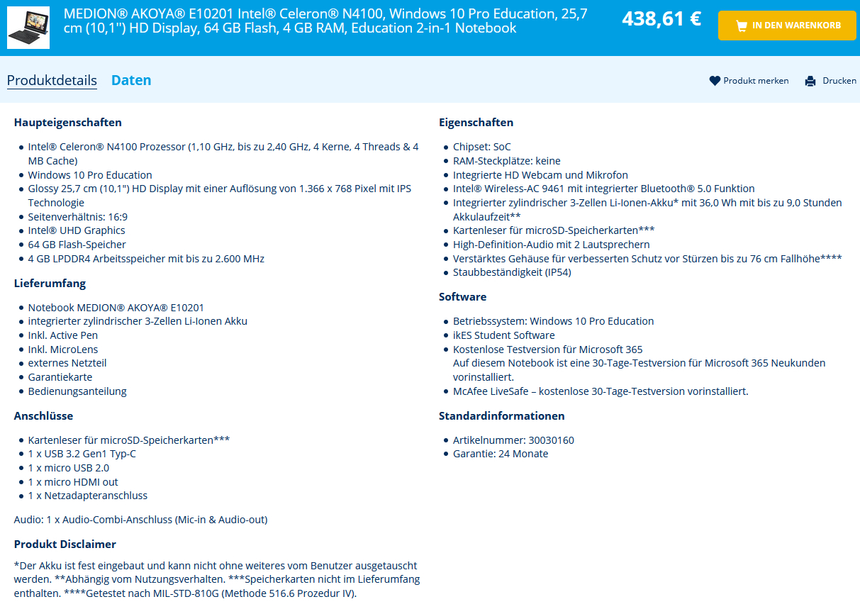 Die neuen Medion Akoya Education-Notebooks richten sich an den Bildungssektor. Alle neuen Laptops der frischen Education-Notebook-Linie sind besonders robust gebaut und speziell auf die Bedürfnisse und Anforderungen im Bildungsbereich abgestimmt. Dazu gehört auch die Betriebssysteme Windows 10 Pro (National Academic) respektive Windows 10 Pro Education, die mit besonderen Features das Lernen und Lehren erleichtern.