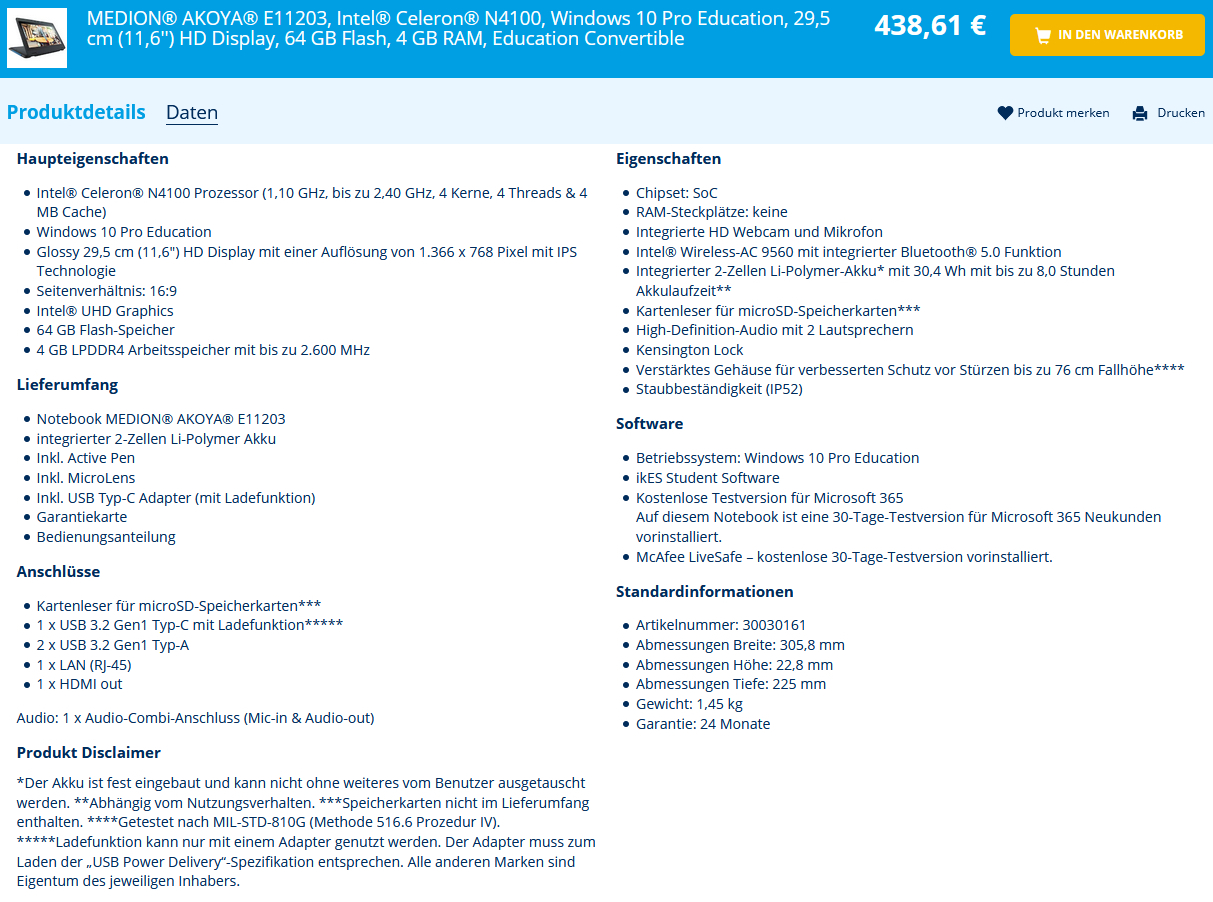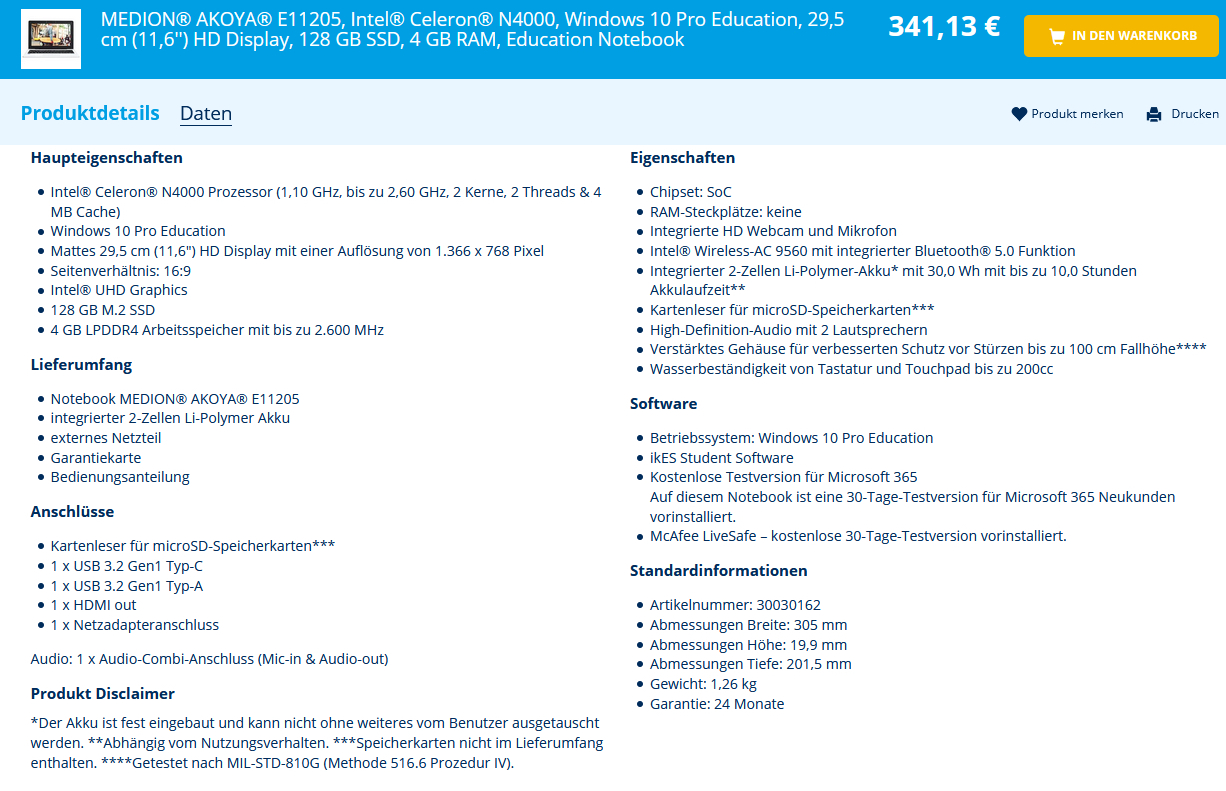 Medion Akoya E11205: Robustes Notebook für die weiterführende Schule