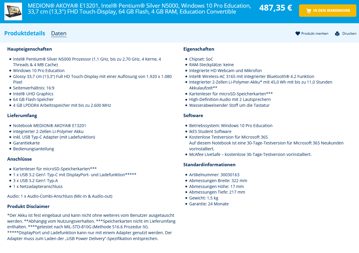 Das 13,3 Zoll große FHD-Touchdisplay des Akoya E13201 bietet eine Auflösung von 1.920 x 1.080 Pixeln, angetrieben wird das Convertible E13201 von einem Intel Pentium Silver N5000 Quadcore-Prozessor inklusive Intel UHD Graphics 605. Als Speicher hat das E13201 4/64 GB (LPDDR4/Flash) an Bord, als Betriebssystem ist Windows 10 Pro Education vorinstalliert. Das Akoya E13201 ist bei Medion ab sofort für 487,35 Euro zu haben.
