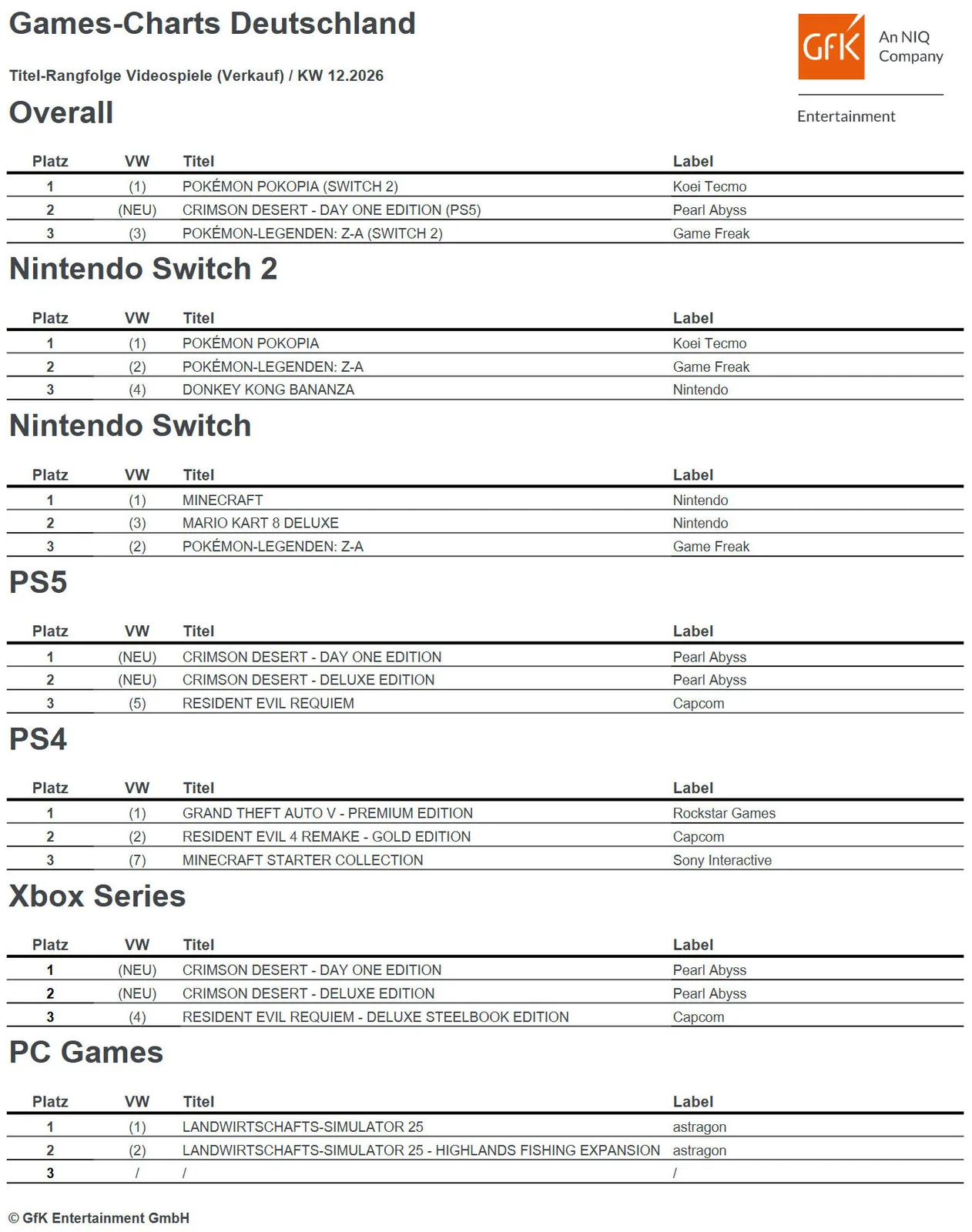 Die einzige echte Bastion gegen das neue Rollenspiel-Epos ist Nintendo. Auf der neuen Switch 2 bleibt Pokémon Pokopia zum dritten Mal in Folge das absolute Maß der Dinge. Der Titel von Koei Tecmo ist nicht nur der Bestseller auf der neuen Nintendo-Konsole, sondern führt auch das plattformübergreifende Gesamtranking der physischen Verkäufe an. Den 2. Platz auf der Switch 2 holt sich Game Freak mit Pokémon-Legenden: Z-A, während Donkey Kong Bananza auf Platz 3 landet. Bei den Last-Gen-Konsolen dominieren weiterhin Dauerbrenner wie GTA V auf der PS4 oder Minecraft auf der alten Switch.