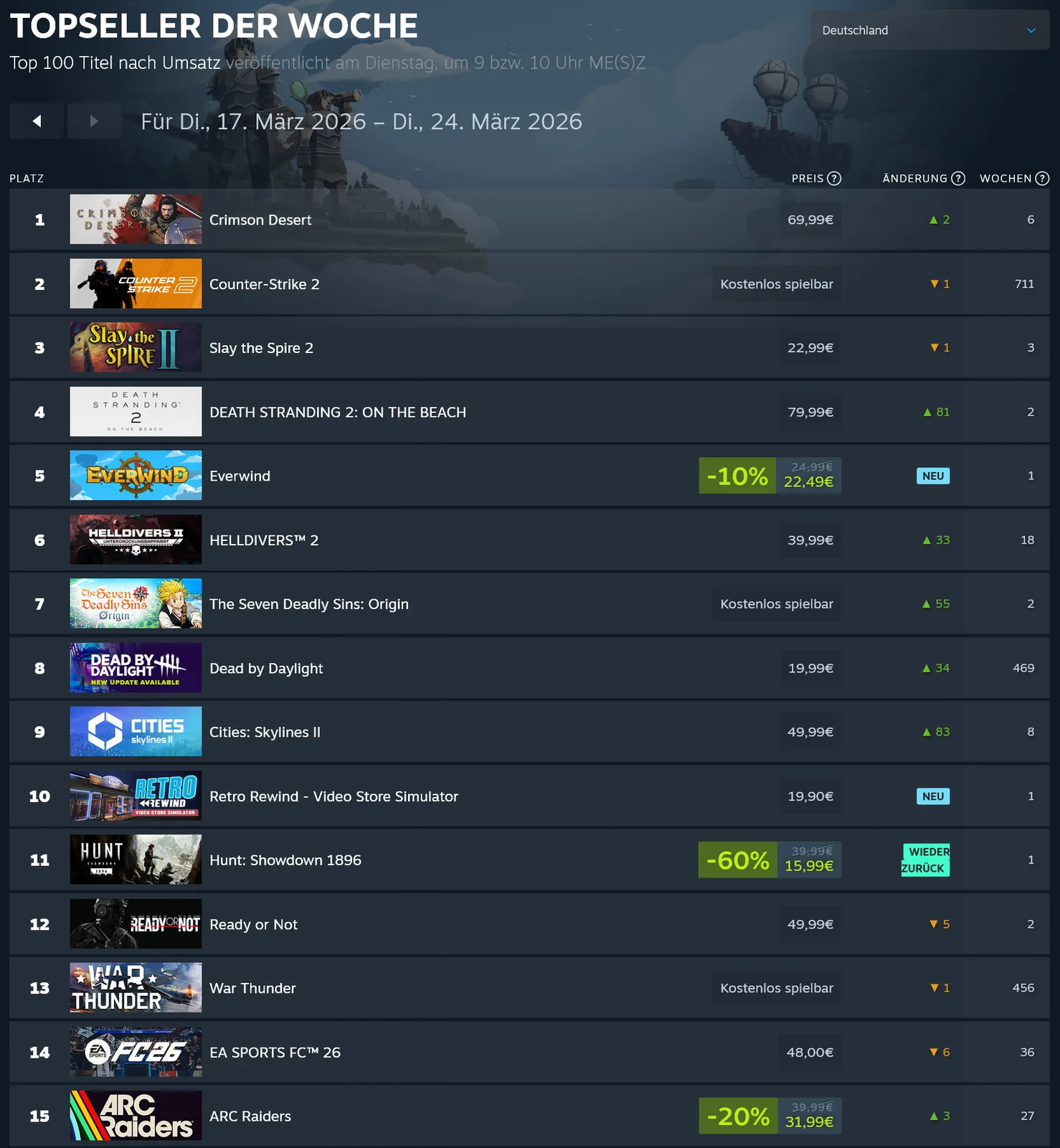Auf dem PC führt aktuell absolut kein Weg an Söldneranführer Kliff vorbei. In den deutschen Steam-Charts für die Woche vom 17. bis zum 24. März 2026 schießt Crimson Desert direkt auf Platz 1. Für 69,99 Euro schnappen sich die PC-Gamer das riesige Mittelalter-Epos und verdrängen den Dauerbrenner Counter-Strike 2 auf den 2. Platz. Direkt dahinter sichert sich Slay the Spire 2 für 22,99 Euro die Bronze-Medaille. Death Stranding 2: On The Beach landet für 79,99 Euro auf Platz 4, während der vergünstigte Neuzugang Everwind für 22,49 Euro die Top 5 abrundet.