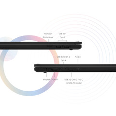 Gearbeitet, gestreamt und mehr wird auf einem 15,6 Zoll großen Wide-View-Display mit IPS-Panel, das mit Full-HD bei 1.920 x 1.080 Pixeln auflöst und bis 180 Grad aufklappbar ist. Zusätzlich lässt sich auf Wunsch über HDMI ein 4K-Monitor mit 60 Hz anschließen. Als weitere Anschlüsse stehen vier USB-Ports bis hin zu USB 3.2 Gen 2 Type-C mit 10 Gbit/s und PowerDelivery, ein kombinierter Audio-Anschluss und ein microSD-Kartenleser parat.